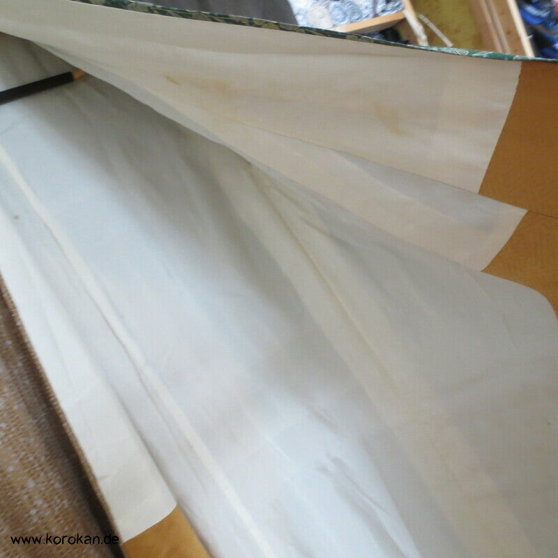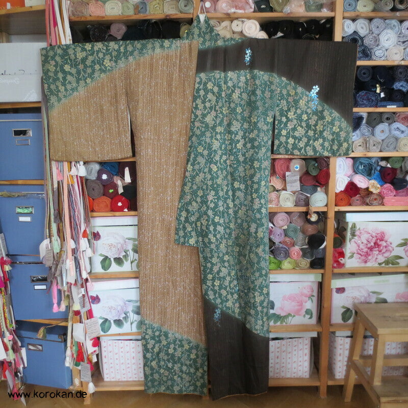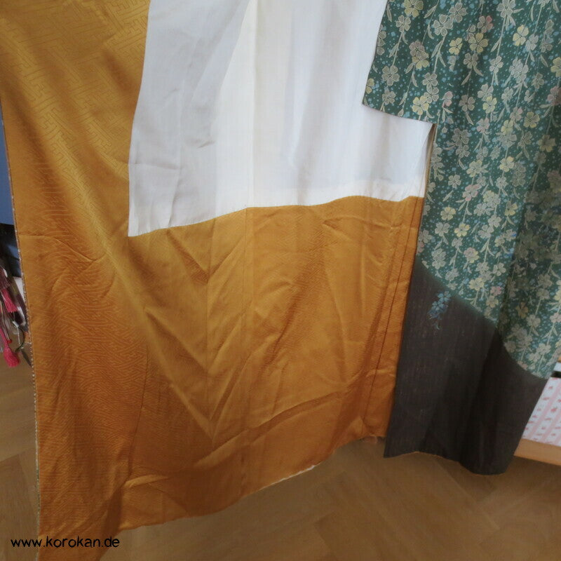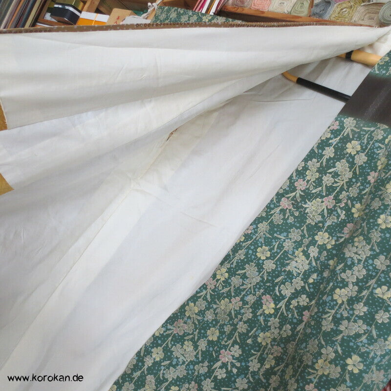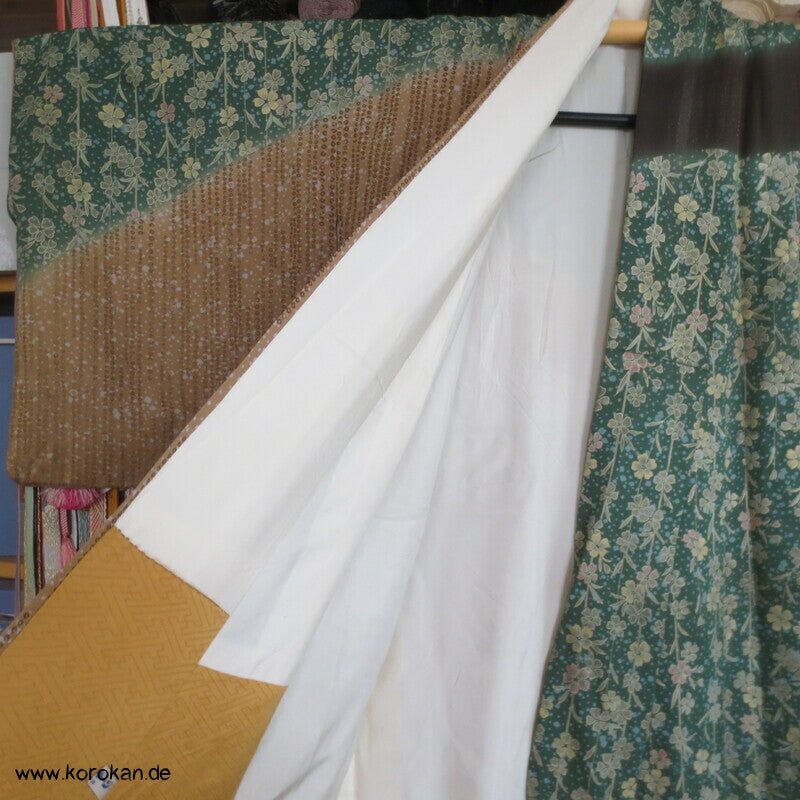 Araihari aufgetrennter Homongi aus Seidendamast mit üppigen Mustern und Glitzerdruck, mit Hakkake und Futter