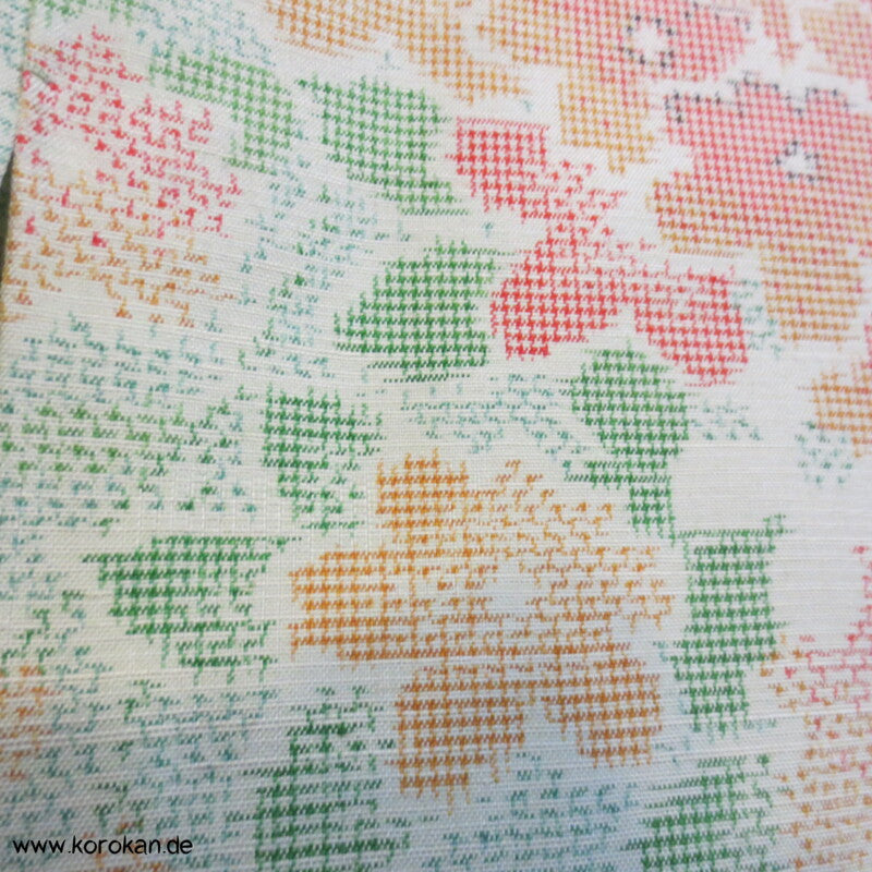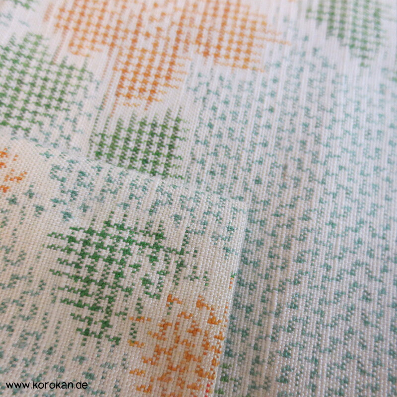 Vintage Hitoe ungefütterter Tsumugi Seiden Kimono Kasuri garngefärbt abstrakte Sakura Blüten in hellgrün, sehr feinteilig