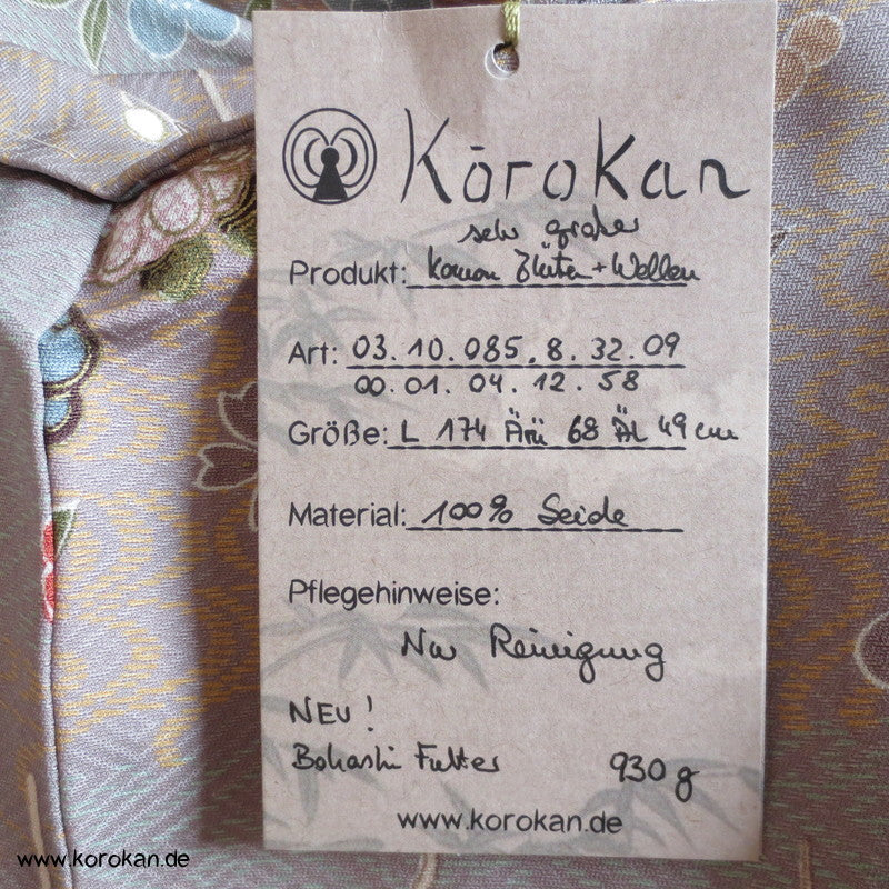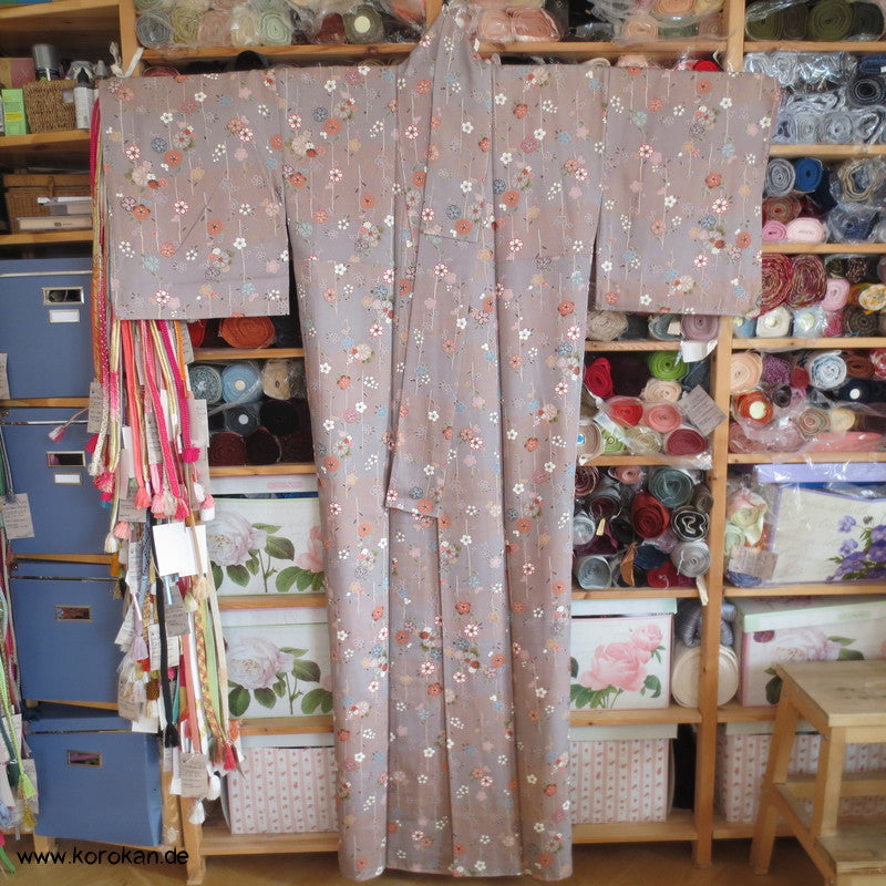 Vintage Komon Kimono Blüten an Zweigen vor Wellen auf mauve Sayagata Seidendamast, oberem hellen Seiden Futter und unterem Hakkake Futter Seidencrepe mit azalee Verlaufsrand.