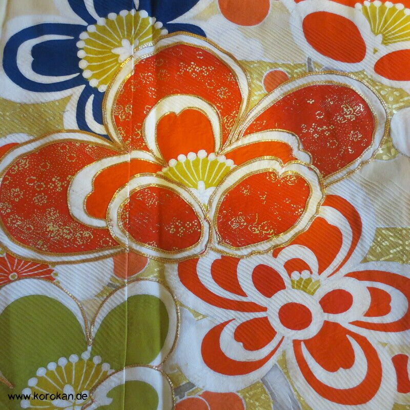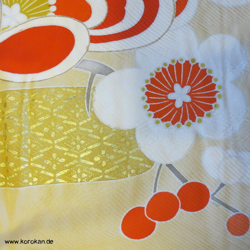 Vintage unbenutzter Karieba Furisode Kimono Stoff stilisierte Sakura Zweige Seidendamast, zugeschnitten, nicht genäht. Neuer Stoff