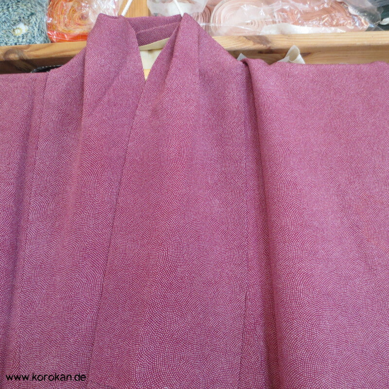 Vintage Komon Kimono Same Edo Komon Seidencrepe, oberen hellen nachgedunkeltem Futter und unterem Hakkake in dunkelrotem Seidencrepe.