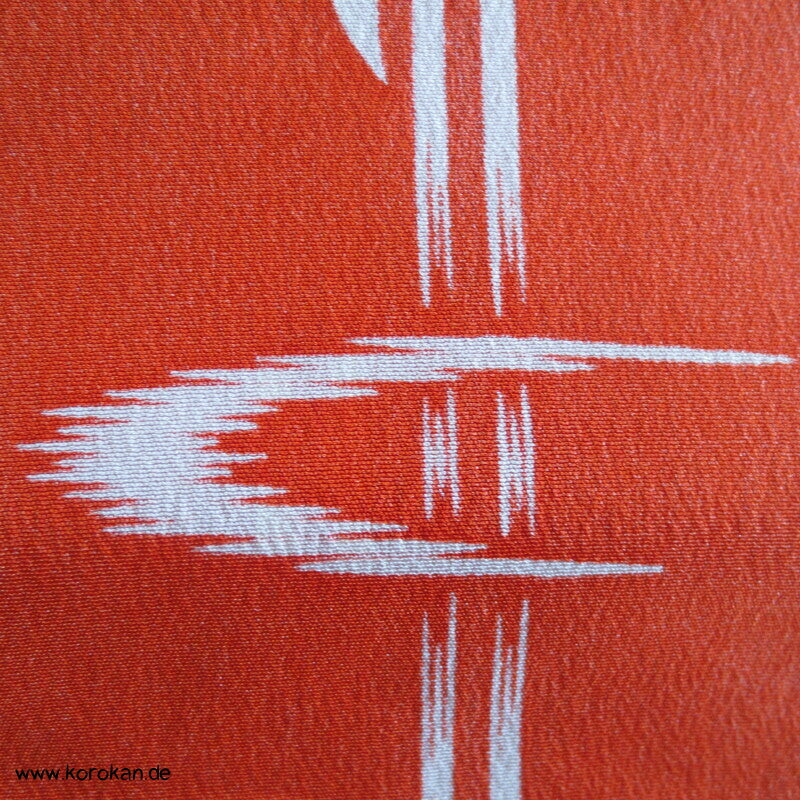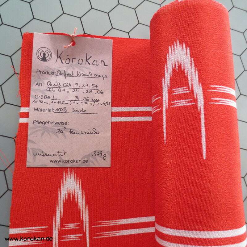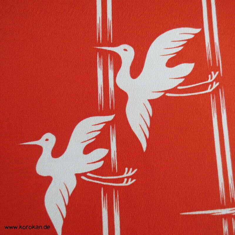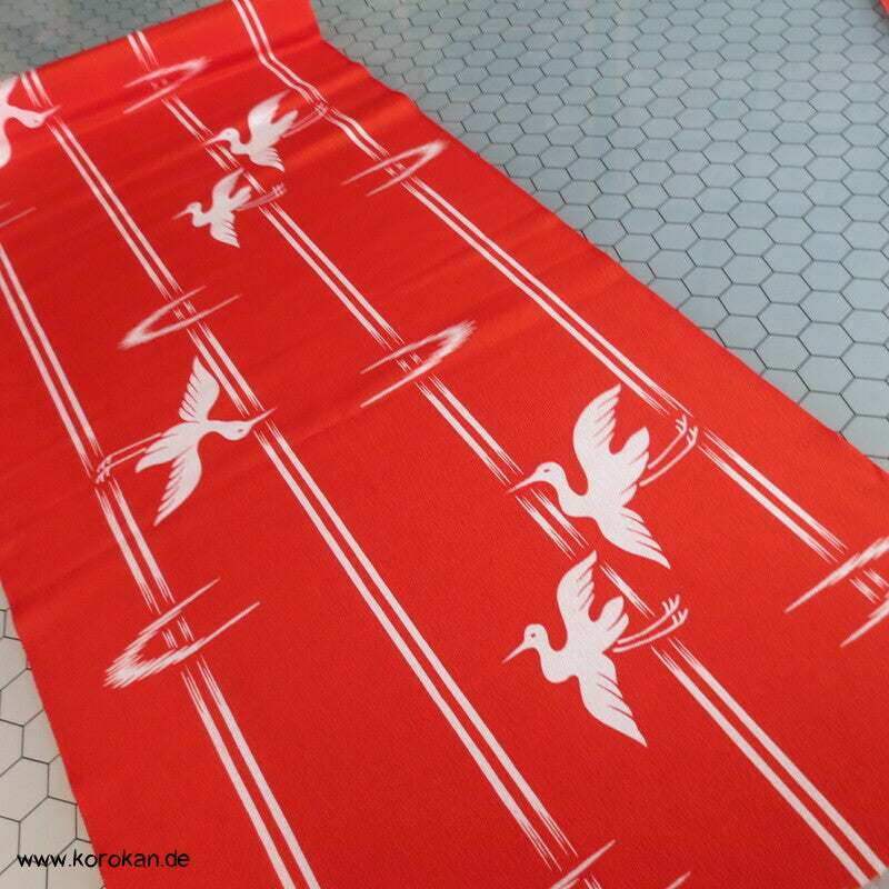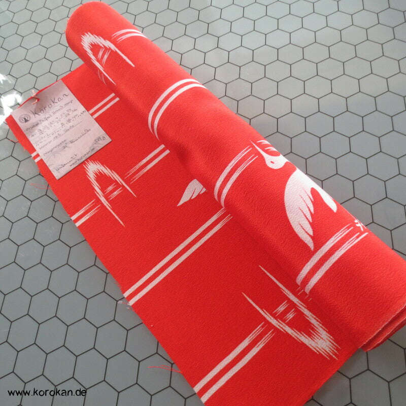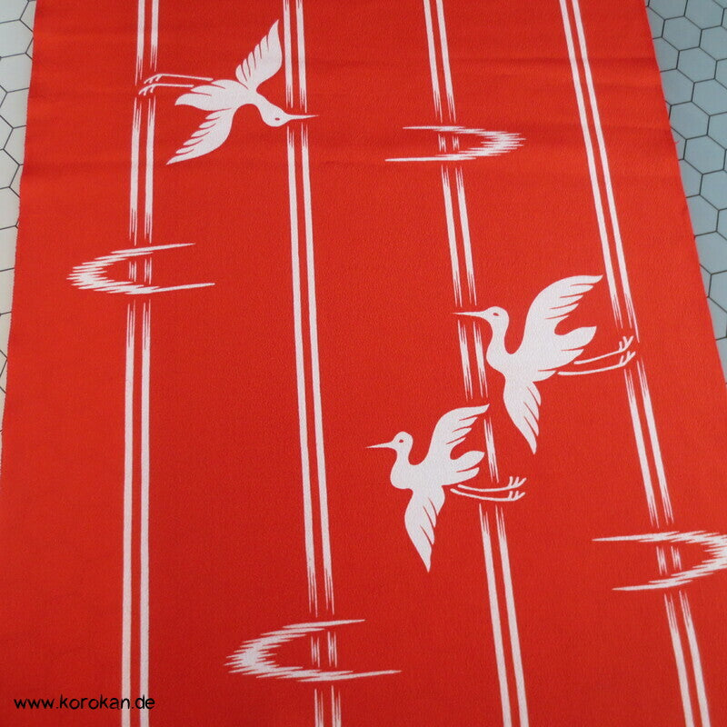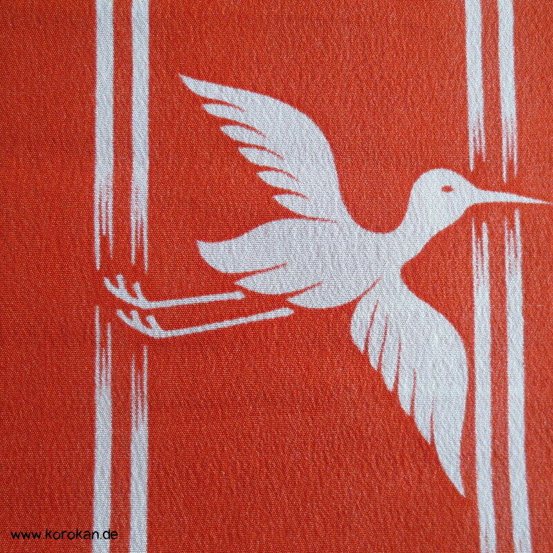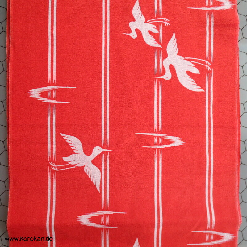 Vintage unbenutzter Stoffrest schwerer Seidencrepe für Kimono Haori Jacke mit Kranichen weiß mit Streifen in persimmon rotorange