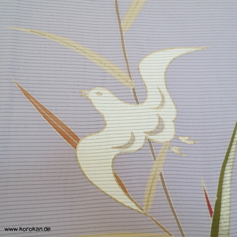 Vintage Hitoe Rho Seide Kimono, auffliegende Sandregenpfeifer zwischen Bambus und Reet am Wasser auf hellgrauem Grund.