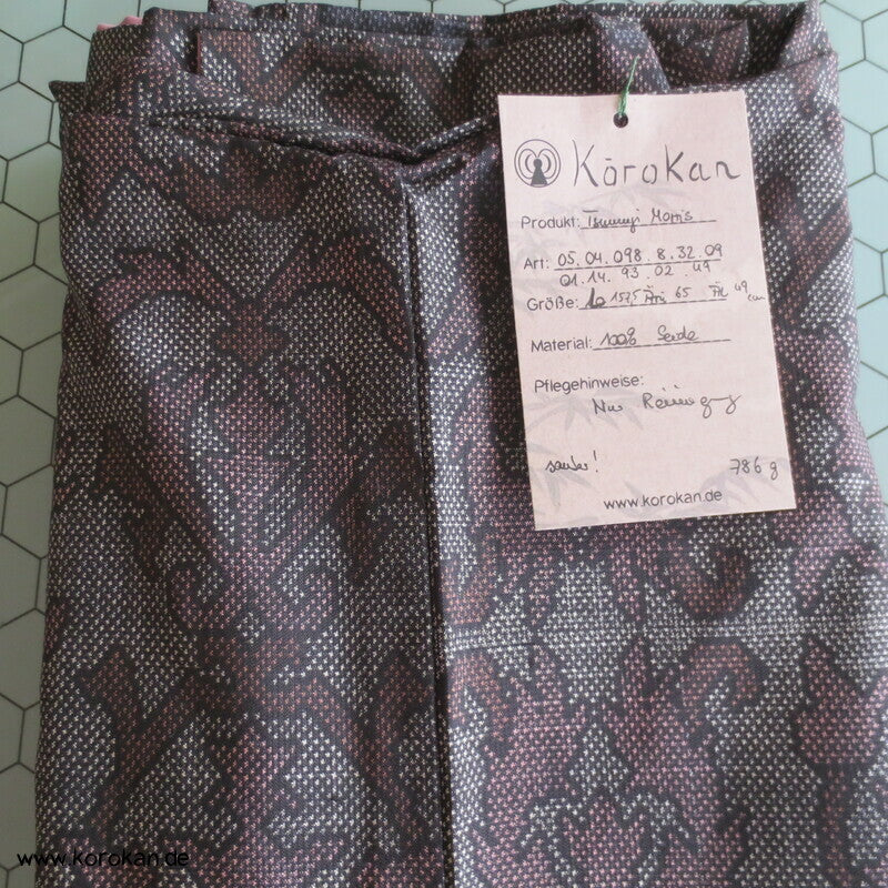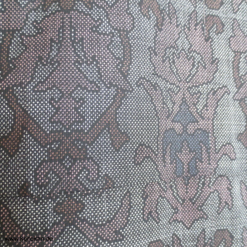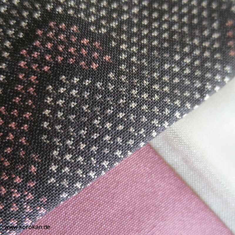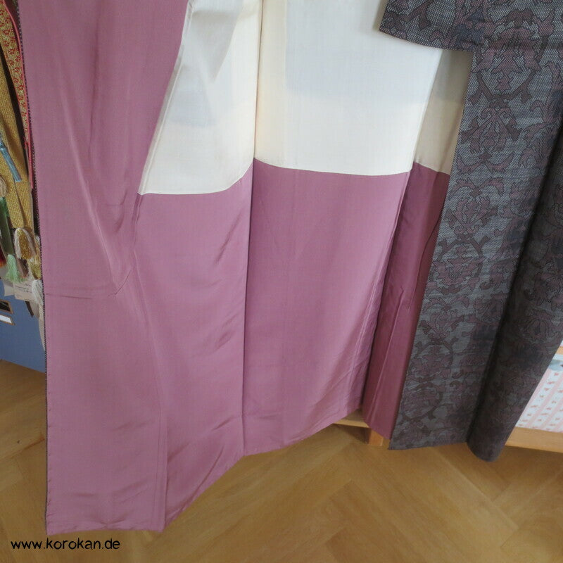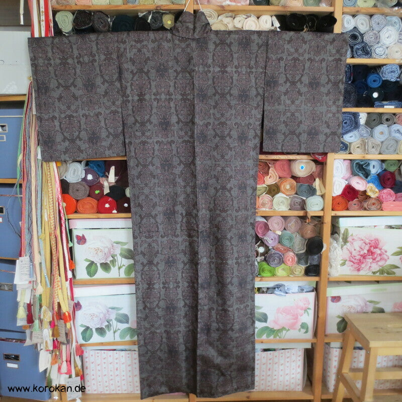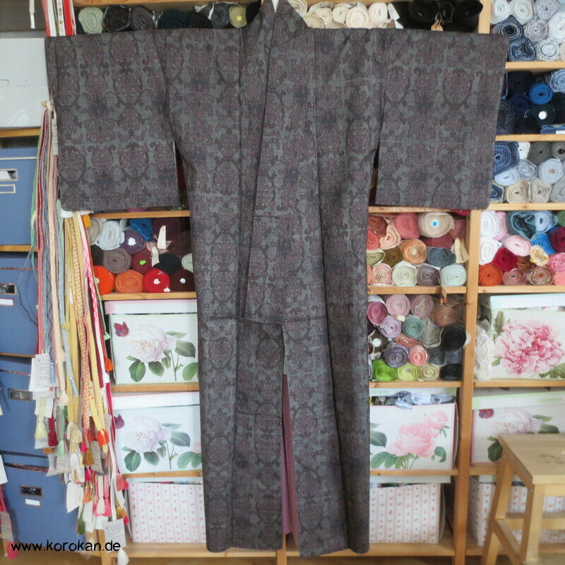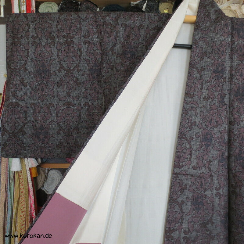 Vintage Tsumugi Seiden Komon Kimono Kasuri Sarasa oder auch Morris Motive in grau rosa schwarz, oberes Futter hell, unteres Hakkake Futter in altrosa Seide