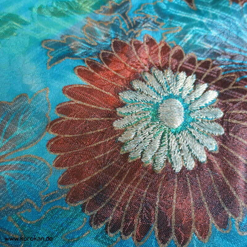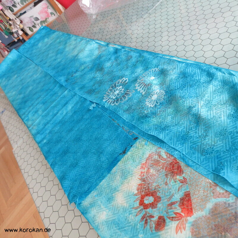Vintage Araihari Furisode Kimono, feine Sayagata Damast Seide mit Blüten und Stickerei - der Kimono war so schmuddelig und nach dem Waschen verfärbt, dass er in Türkis mit Verlaufsfarben überfärbt wurde