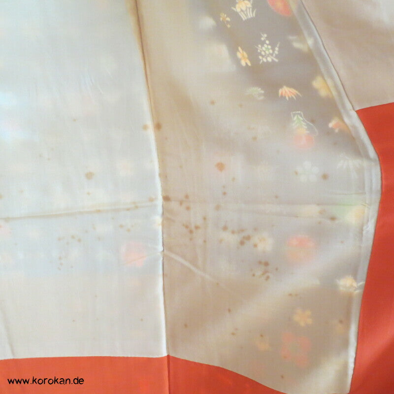 Vintage Komon Kimono Mon Druck auf blau, unteres Teilfutter rot. Seidencrepe, helles Seidenfutter oben