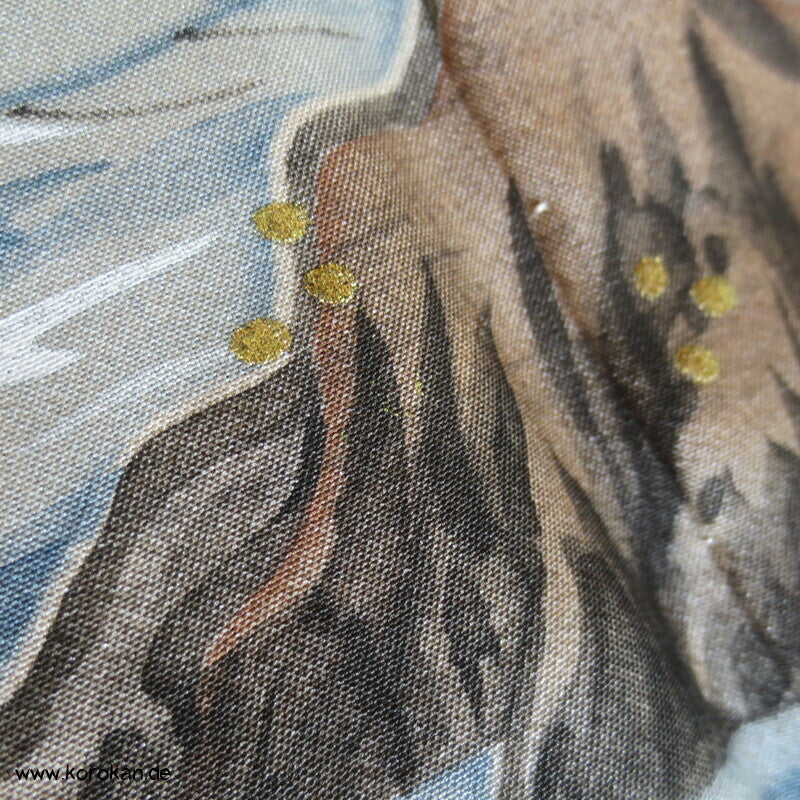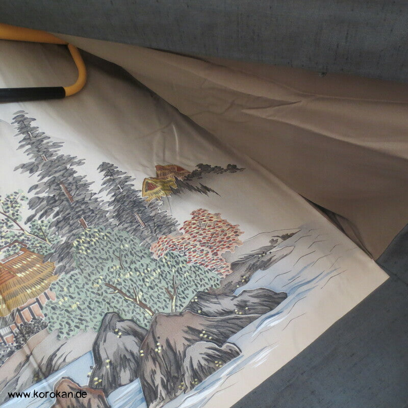 Vintage japanische Männer Haori aus schiefergraugrüner grob gewebter Fushi Tsumugi Seide mit Seidenfutter handbemalt mit Flusslandschaft und Dorf vor Fuji san
