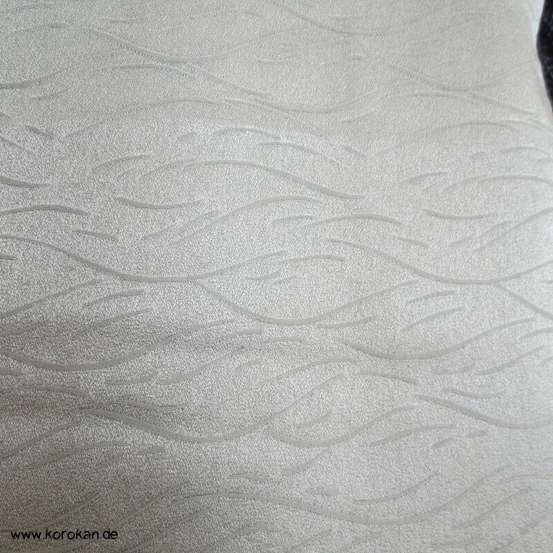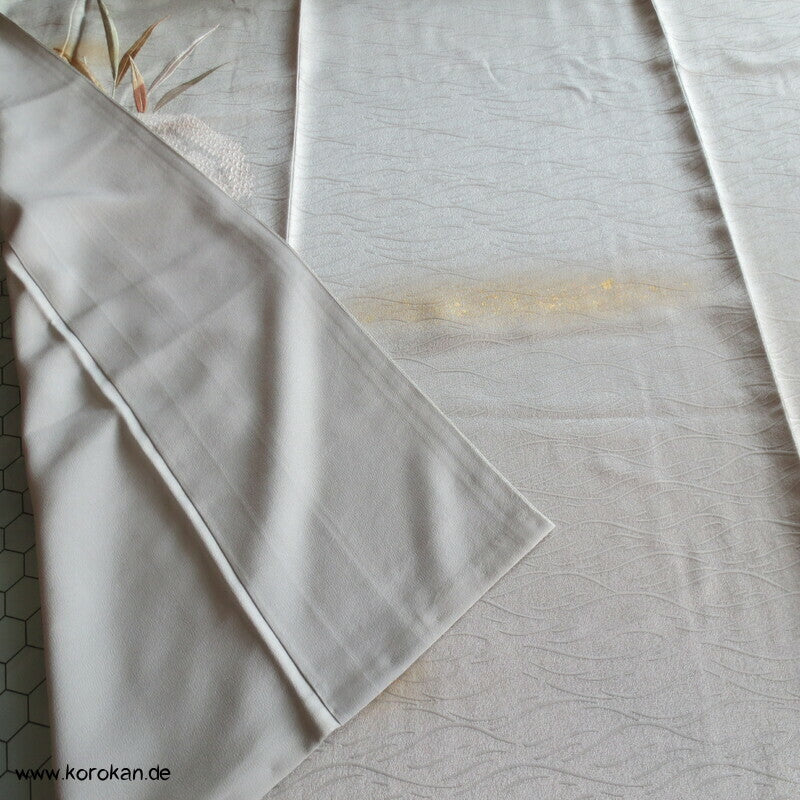 japanischer Vintage Homongi Kimono Wellen Seidendamast mit Shibori Bambusgittern und bestickt mit Bambus Zweig, feinem oberen hellen Seidenfutter und unterem Hakkake Bokashi Verlaufsrand Seidenfutter.