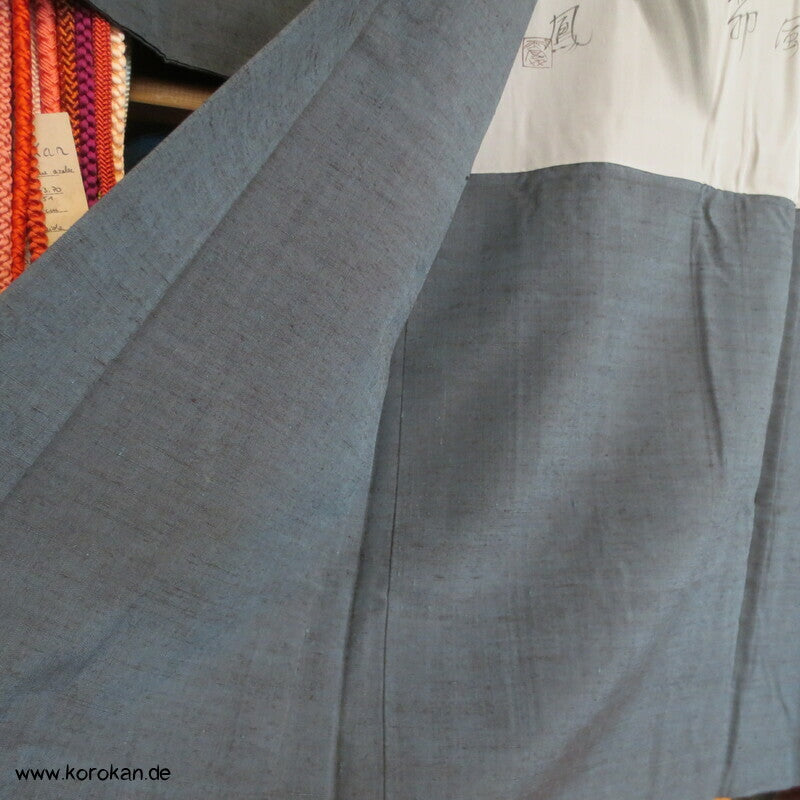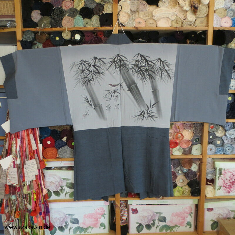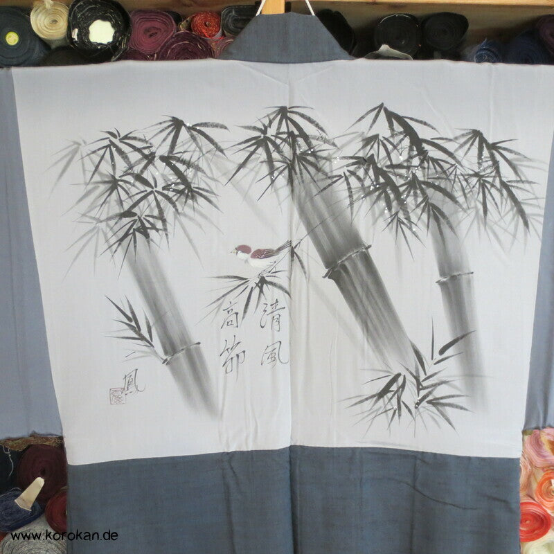Vintage japanische Männer Haori aus jeansblau grob gewebter Fushi Tsumugi Seide mit Seidenfutter handgemalte sehr schlecht gelaunter Spatz im Bambusbusch mit Gedicht und Künstlersignatur
