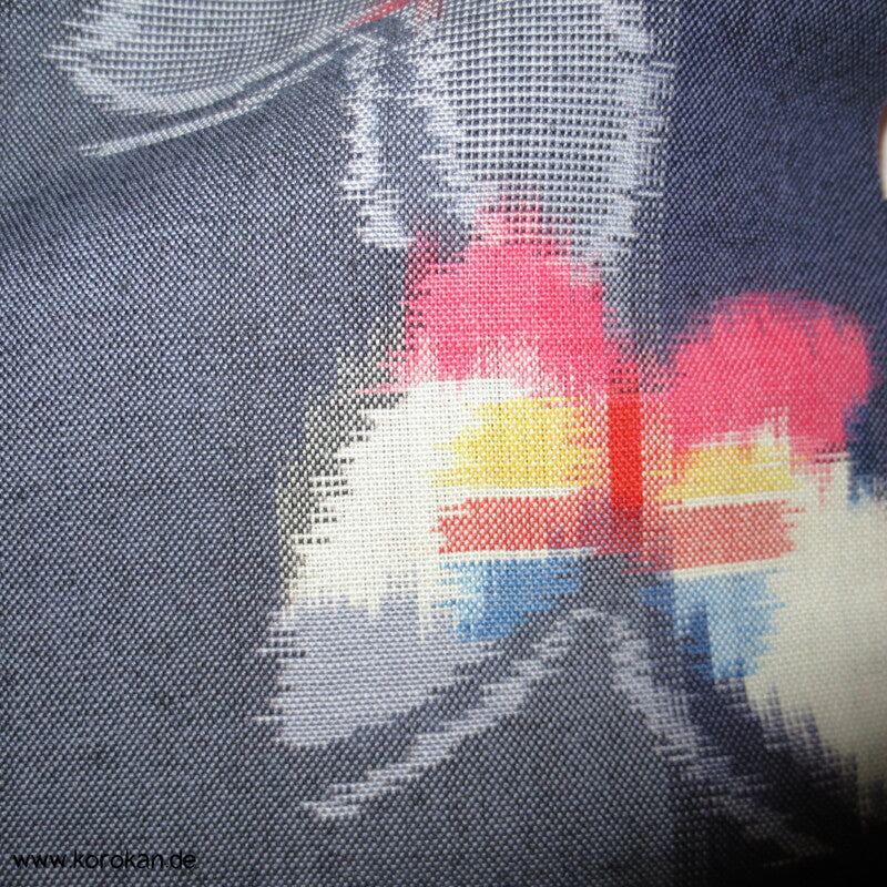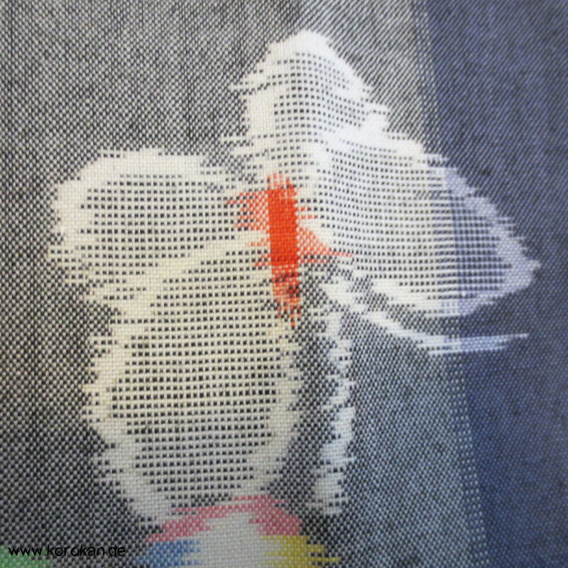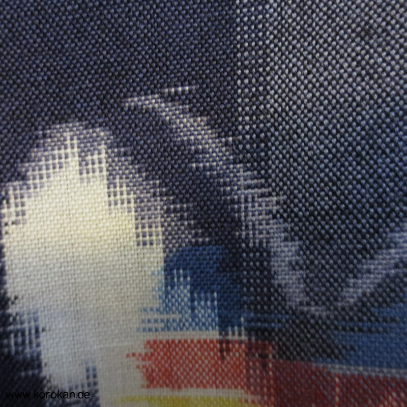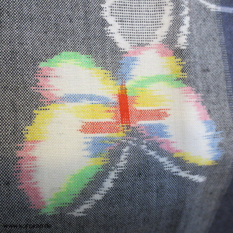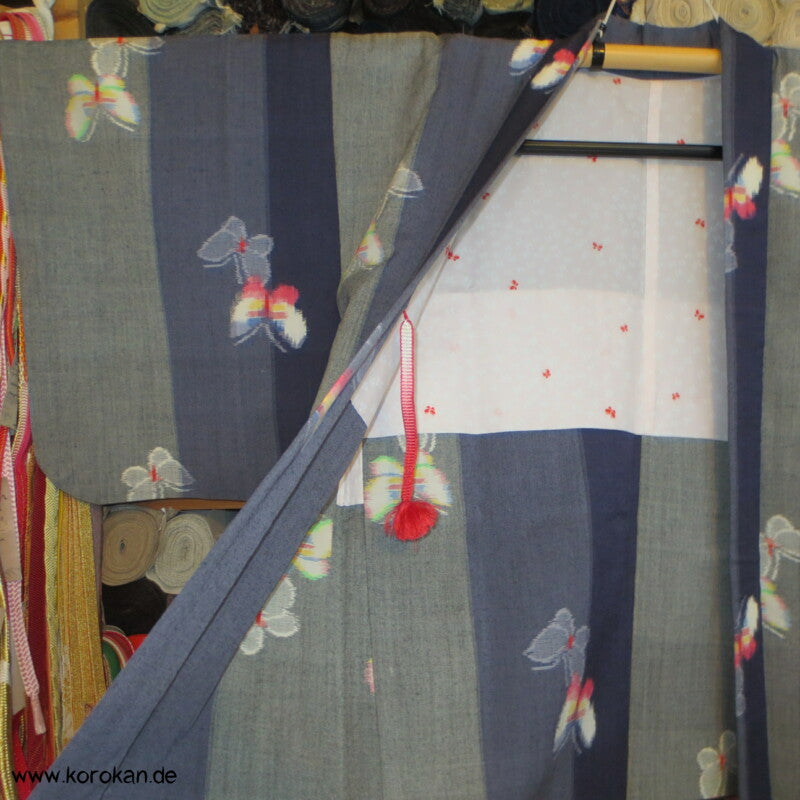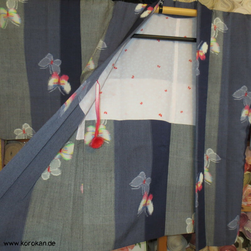 Vintage Kasuri Woll Haori Kimono Jacke, bunte Schmetterlinge auf blaugrau, garngefärbtes Muster.
