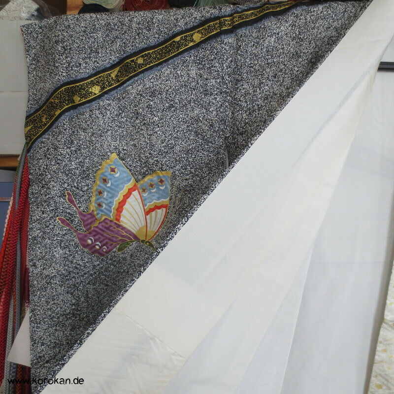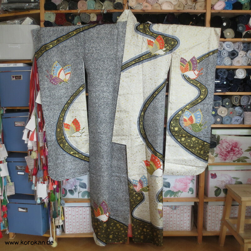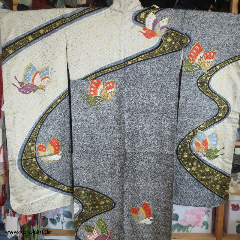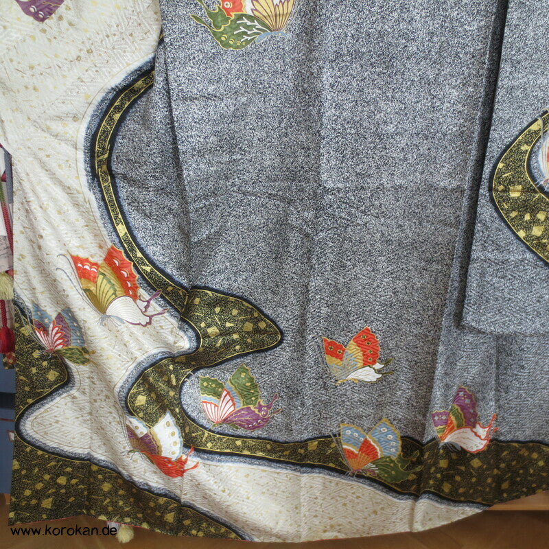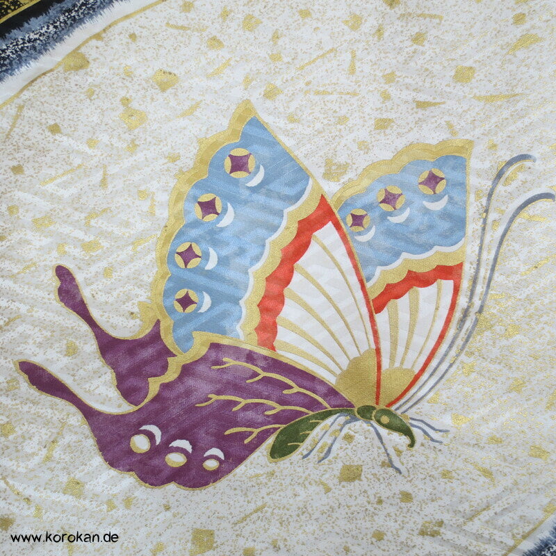 Vintage Furisode Sayagata Seidendamast Schmetterlinge auf Milchstraße, lauter Schneegestöber Golddruck