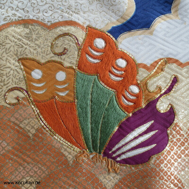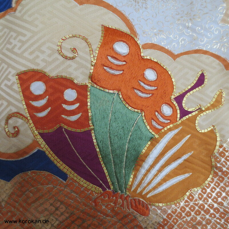 Vintage Homongi Kimono kobaltblauer Sayagata Seidencrepe mit großen Schmetterlingen, teilbestickt, feinem oberen hellen Seidenfutter und unterem Hakkake orangenem Bokashi Verlaufsrand Seidenfutter, mit Han Eri.