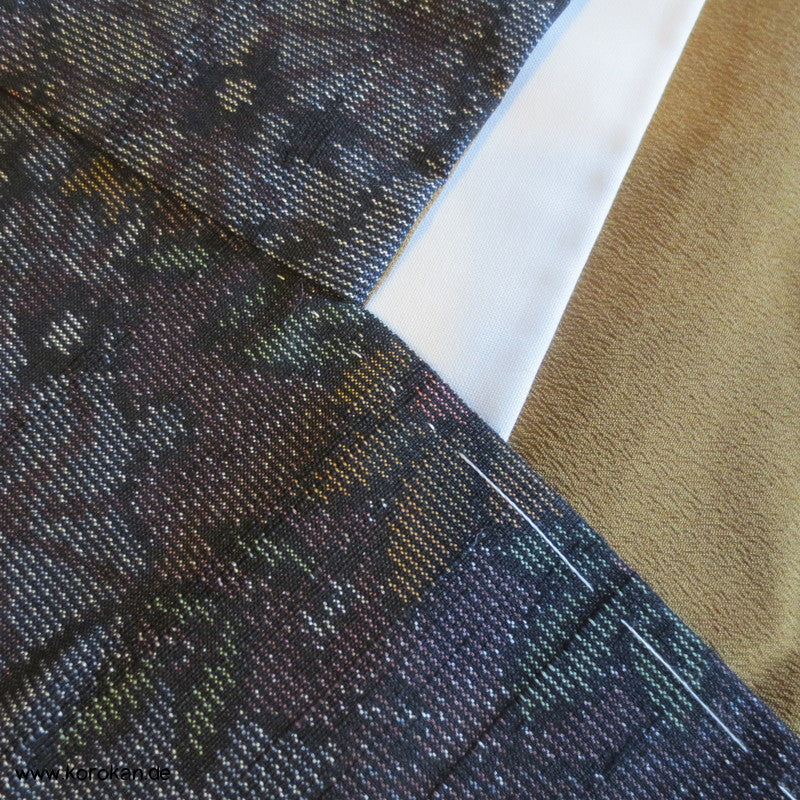 Vintage Tsumugi Seiden Komon Kimono Kasuri Schneeflocken mit Motiven, oberes Futter hell, unteres Hakkake Futter in hellbrauner Seide