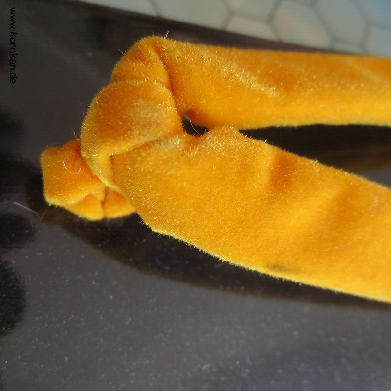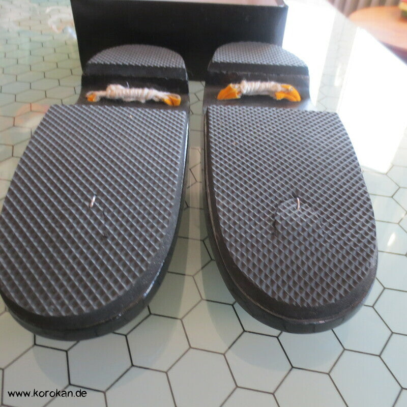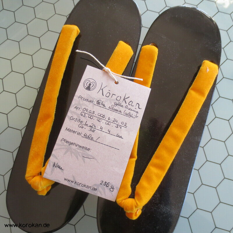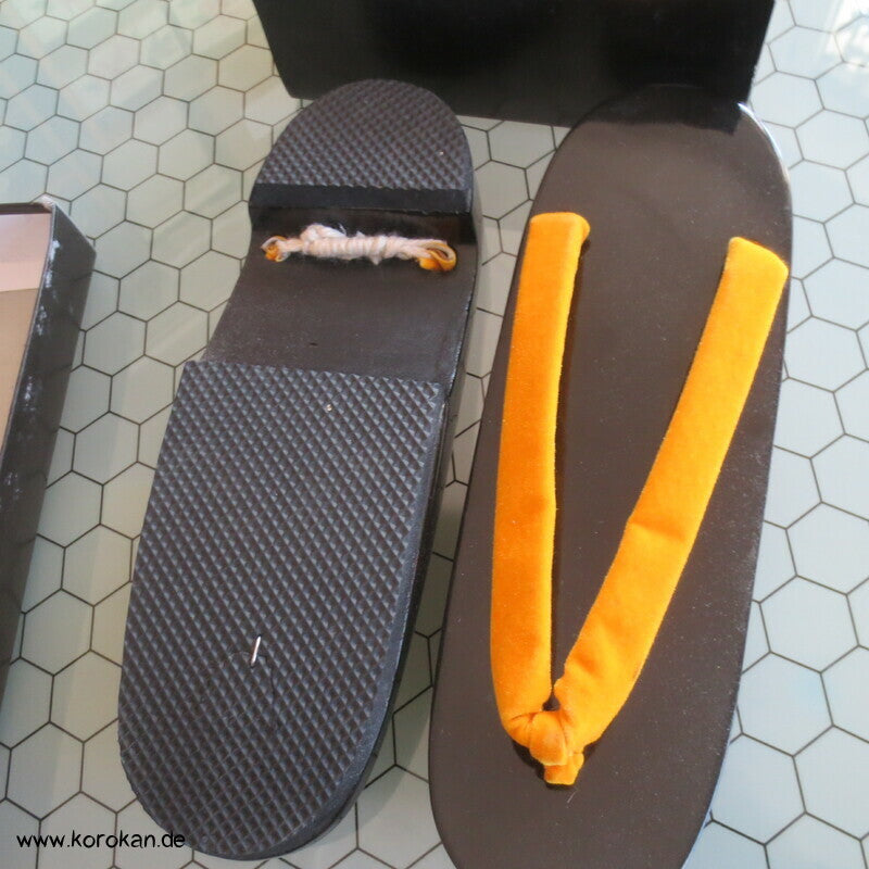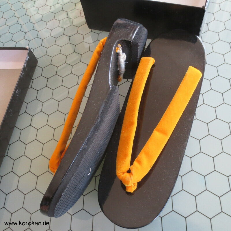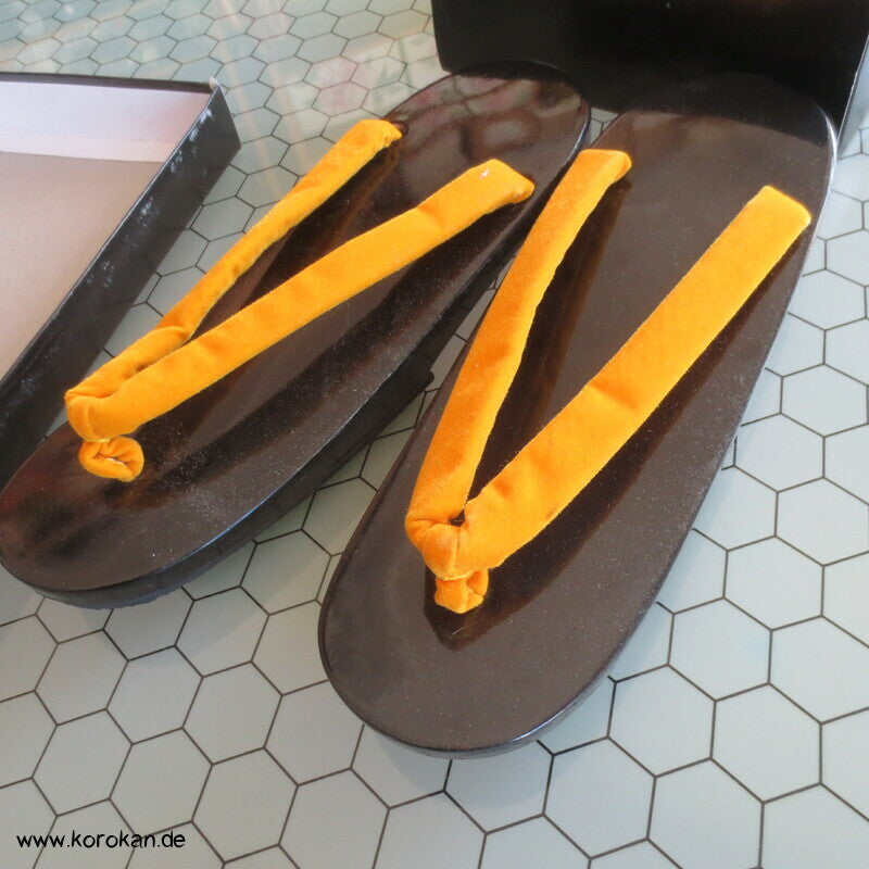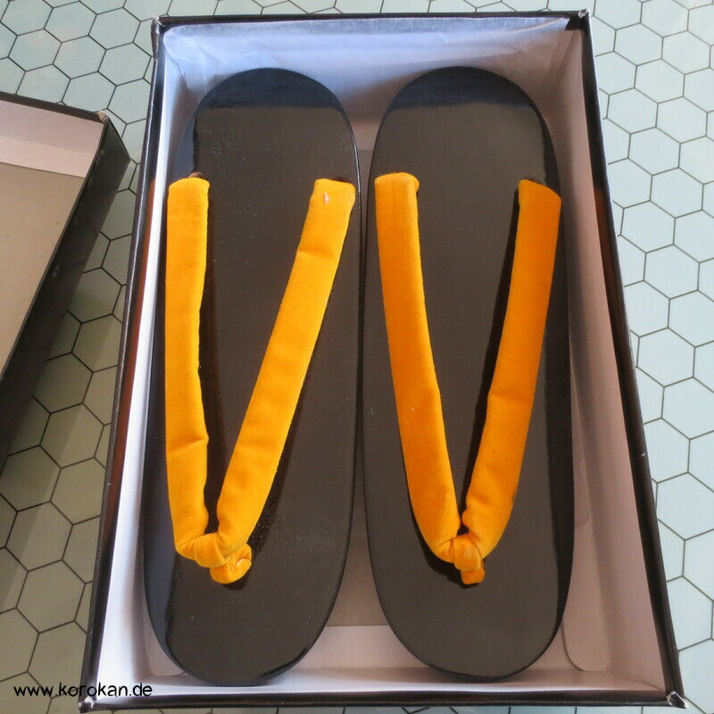 schwarz lackierte Geta mit gelben Samtriemen, neu