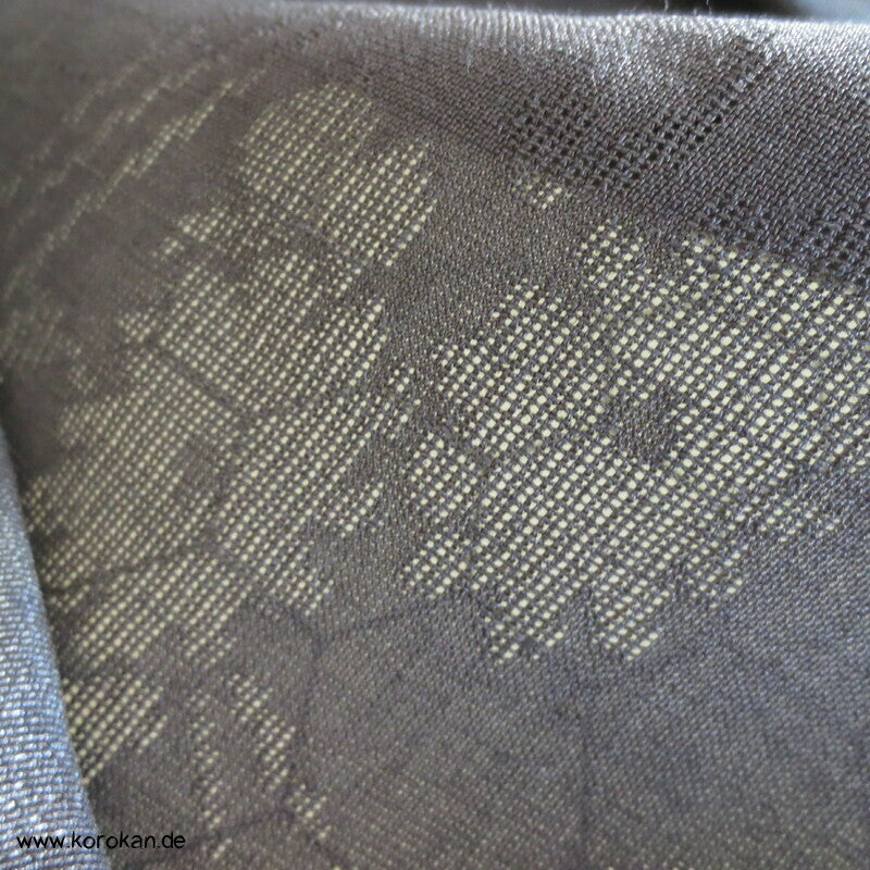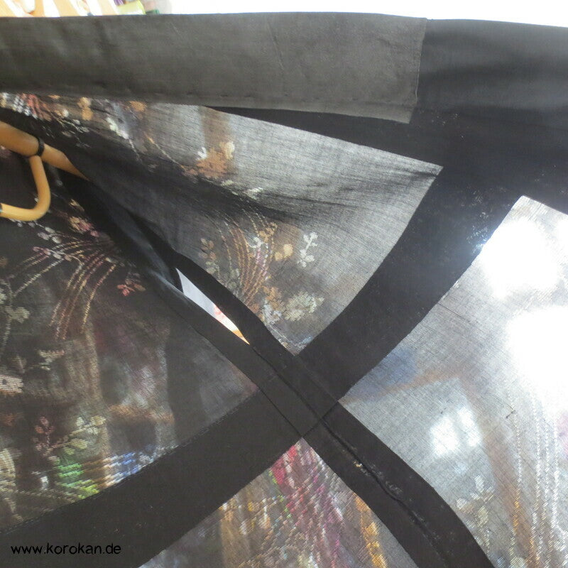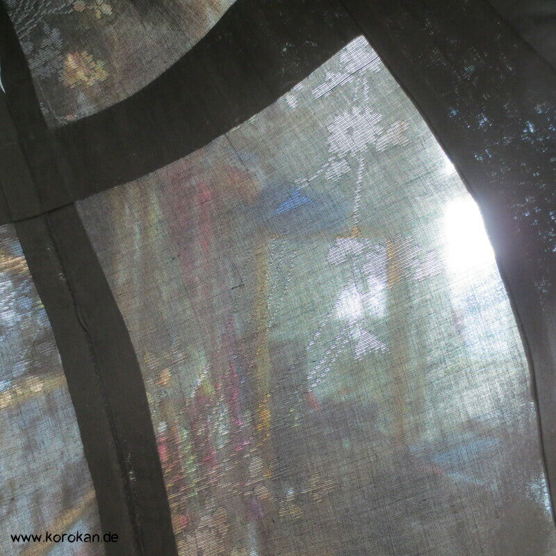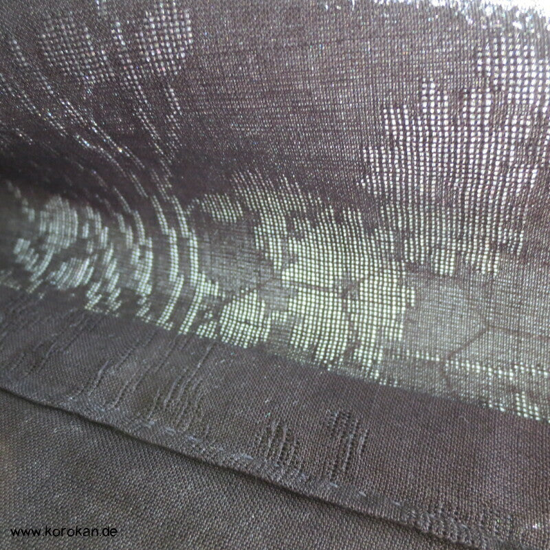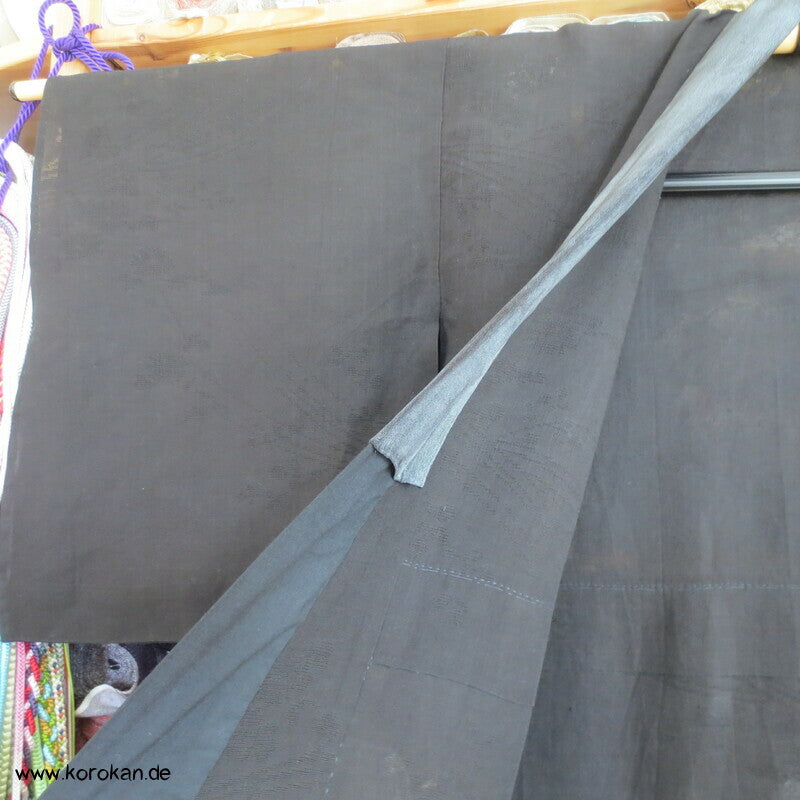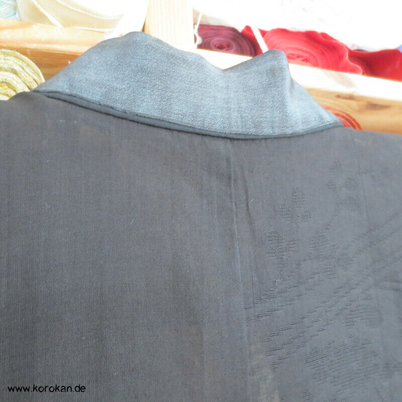 Vintage Juban Unter Kimono aus feinstem Hanf Drehergewebe mit eingewebten Blüten, Unterkragen Baumwolle mit Acetat Han Eri benäht. Wohl in Deutschland schwarz überfärbt - wobei der Kragen nur silbergrau geworden ist - das Hanf Baumwoll material schön schwarz. komplett sauber und hier in Berlin bei korokan aufgebügelt. Heile, sofort tragbar