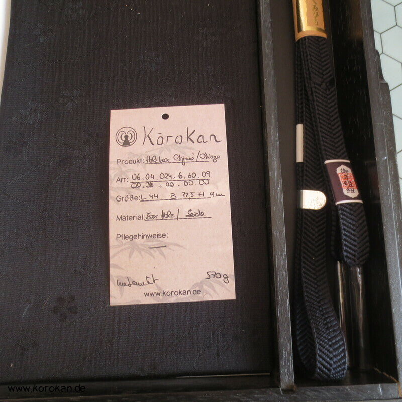 Vintage unbenutzte Obijime und Obiage in schwarz lackierter Holzbox