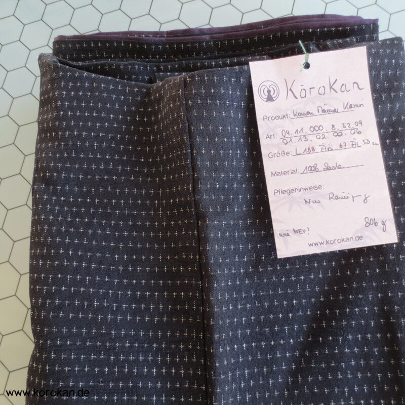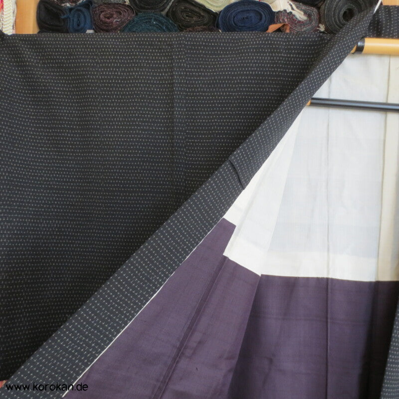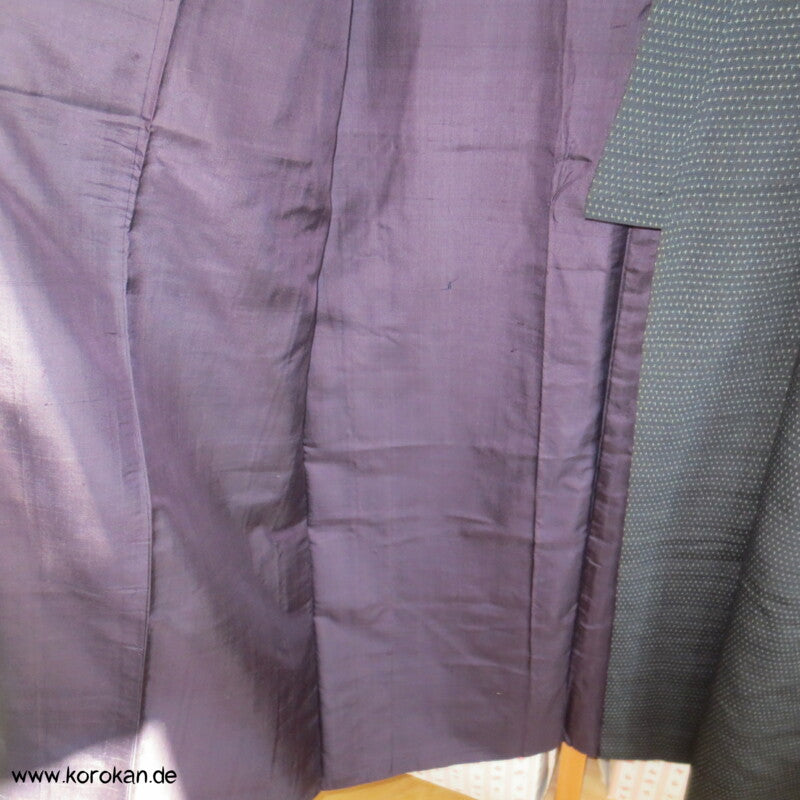 Vintage Männer Tsumugi Seiden schwarz mit kleinen weißen Kasuri Kreuzen Kimono, oben helles und unten mit blauem Baumwoll Chintz Futter