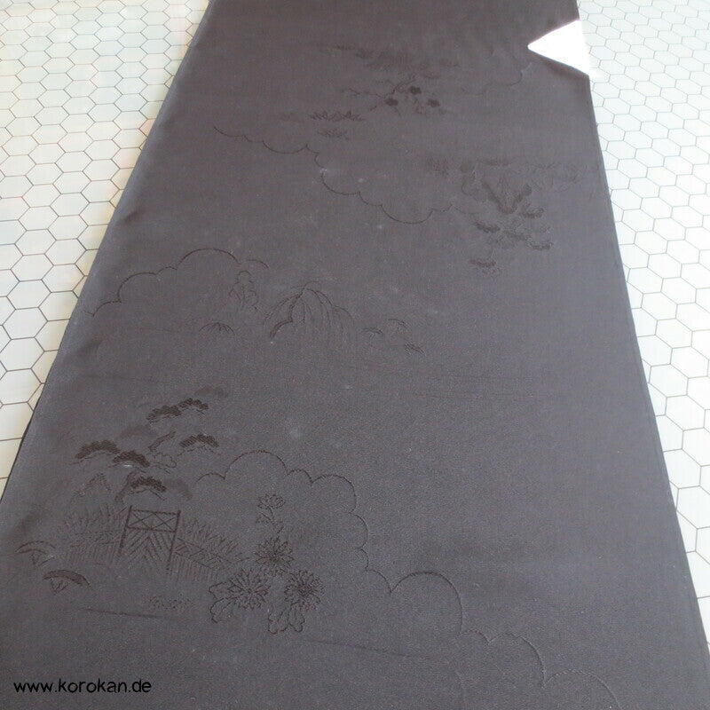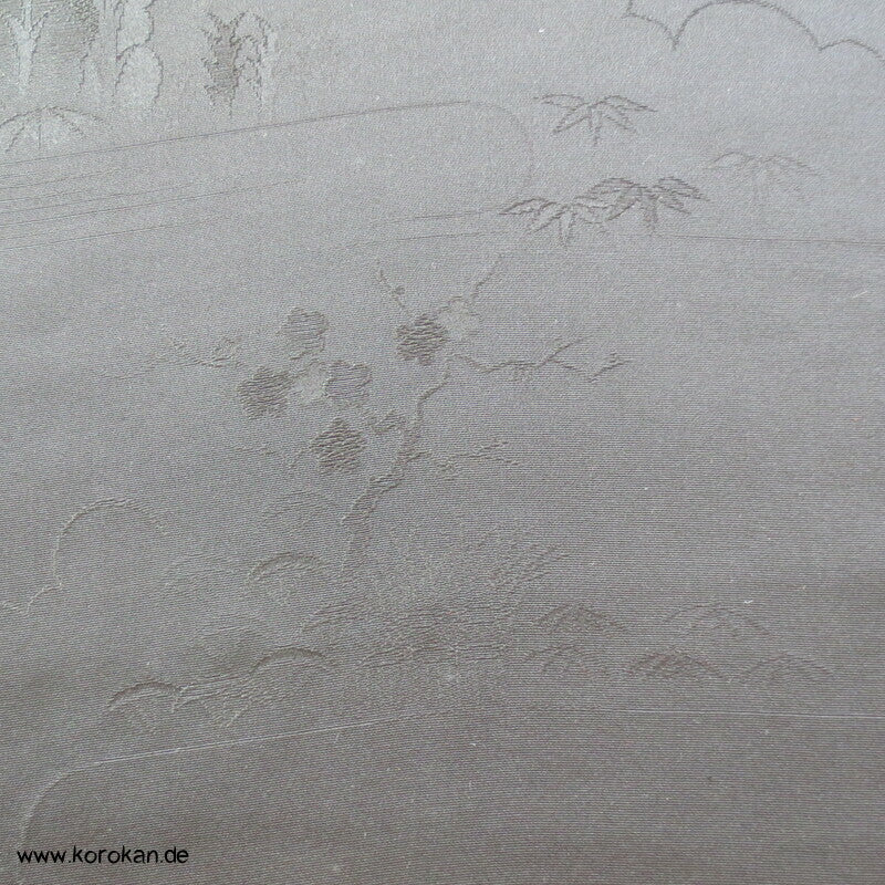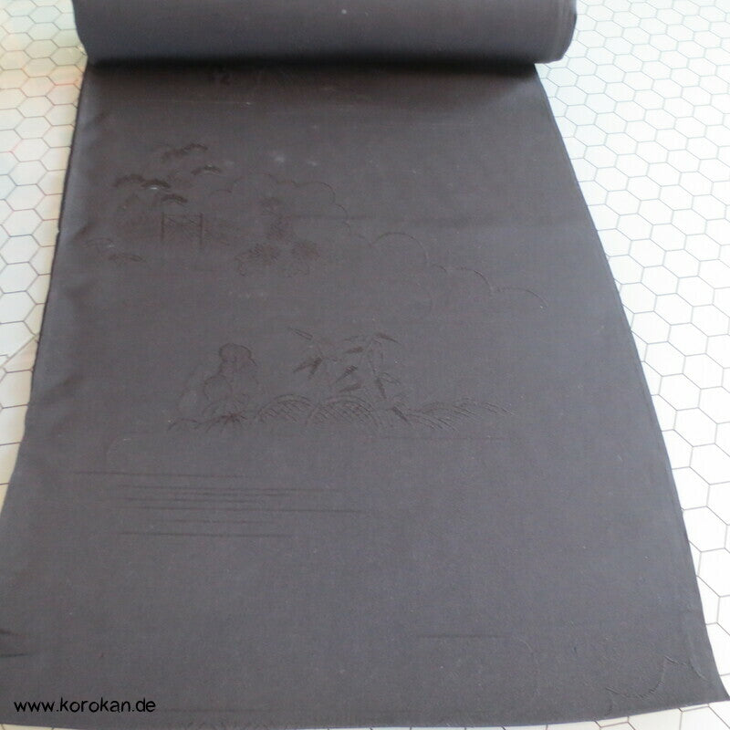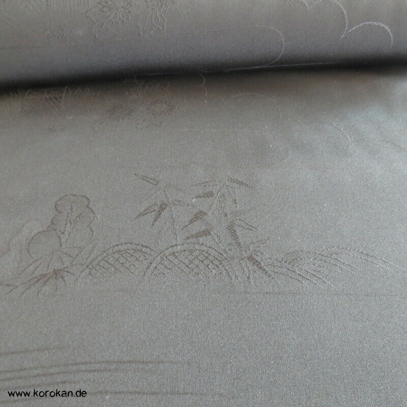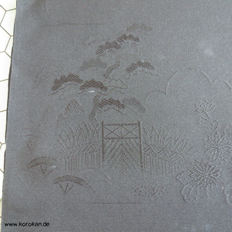 Vintage unbenutzter originalgehefteter Tanmono schwarzer Haori Kimono Damast Seiden Stoff - = Tanmono mit Stempeln. verschiedenste Bäume und Pflanzen mit Bambusgittertoren gewebt