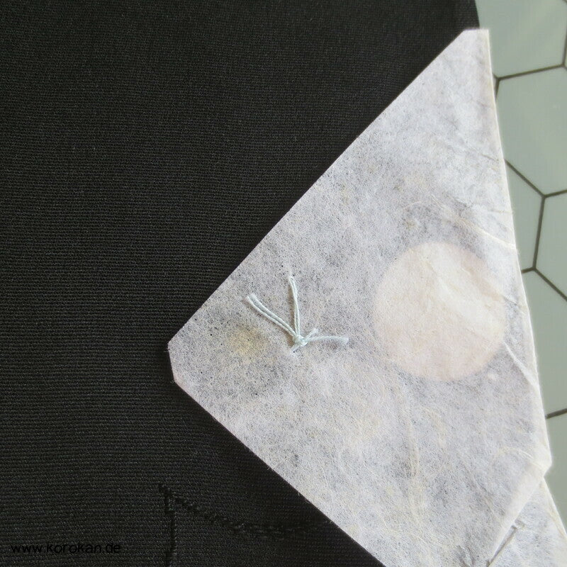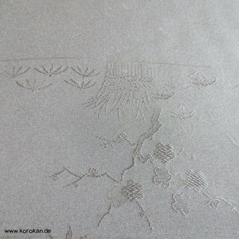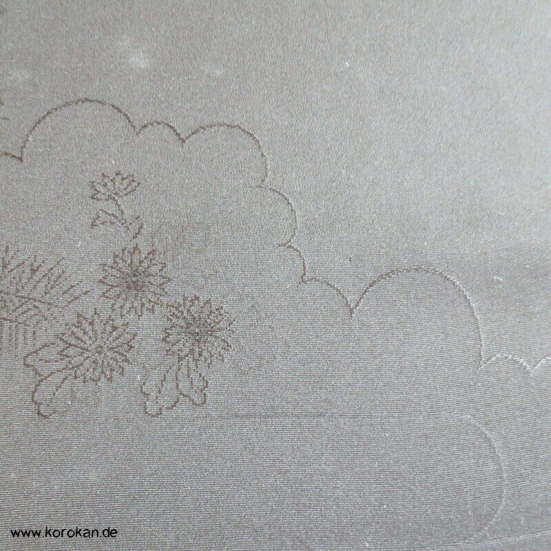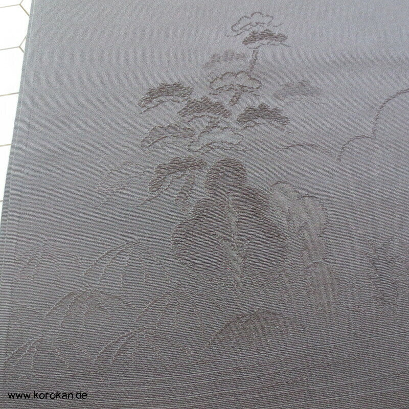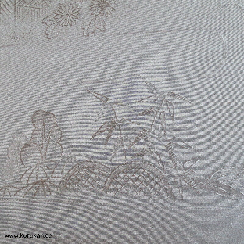 Vintage unbenutzter originalgehefteter Tanmono schwarzer Haori Kimono Damast Seiden Stoff - = Tanmono mit Stempeln. verschiedenste Bäume und Pflanzen mit Bambusgittertoren gewebt