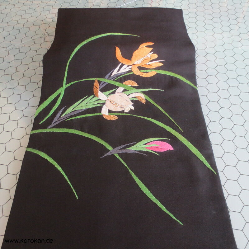 schwarzer Seiden Nagoya Obi, gesticktes Iris Motiv
