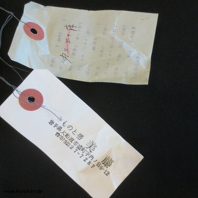 Vintage unbenutzter japanischer Stoffballen schwarzer pflanzengefärbter Chirimen Crepe Seide mit Wisteria Mon für formelle Montsuki und Mofuku Kimono und Haori.