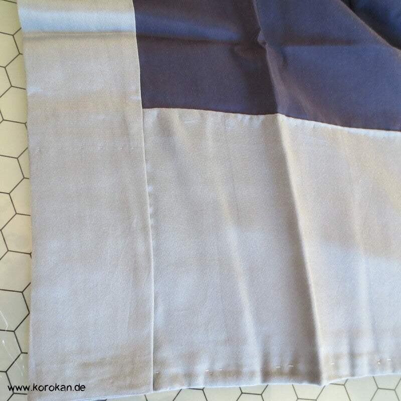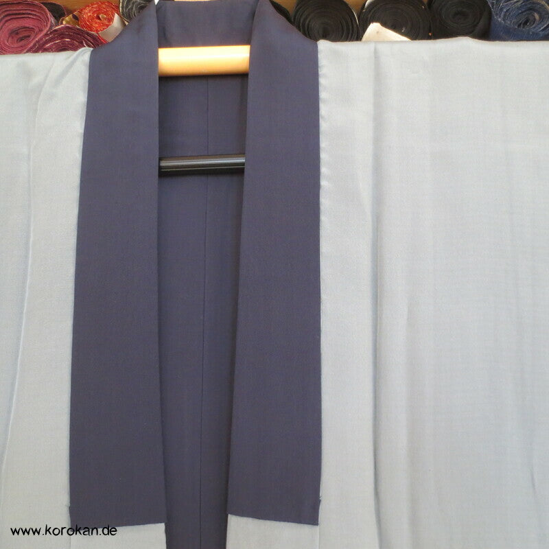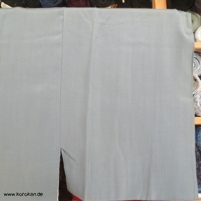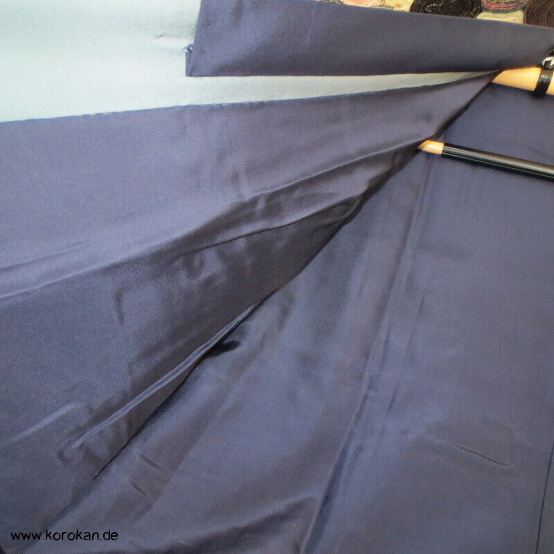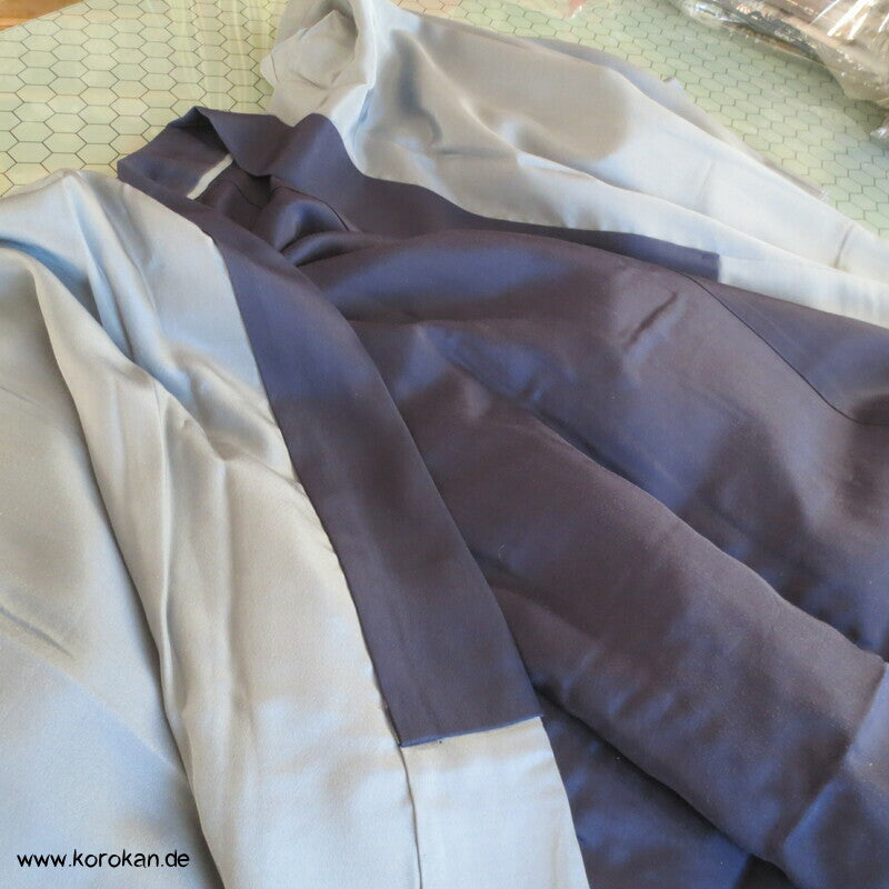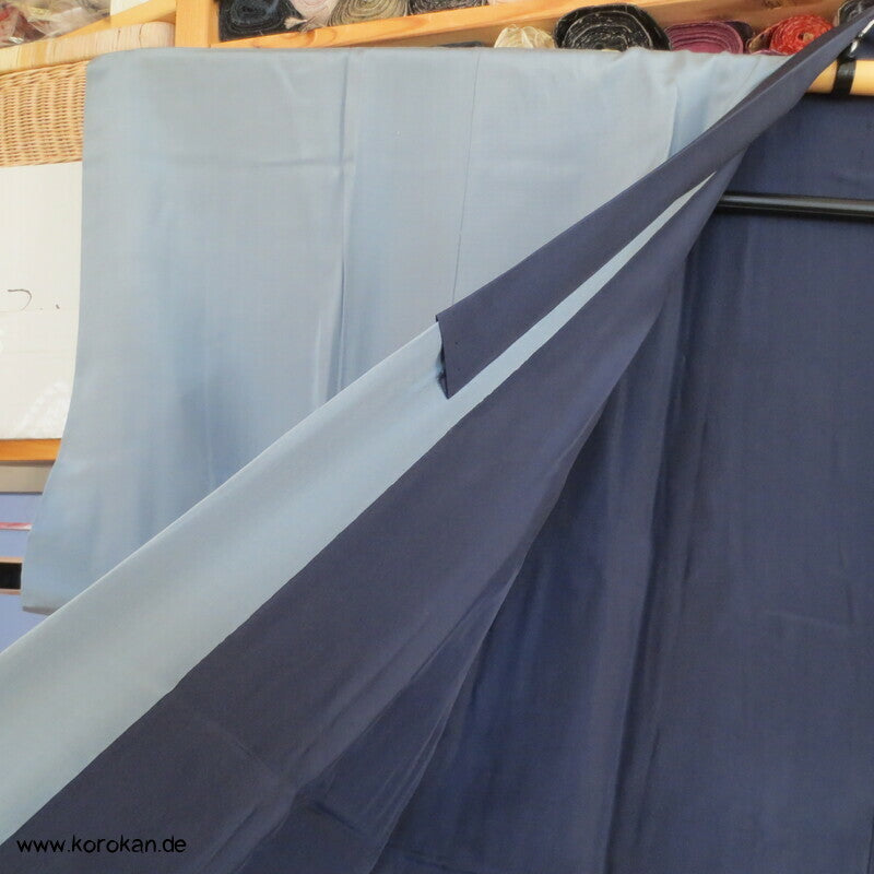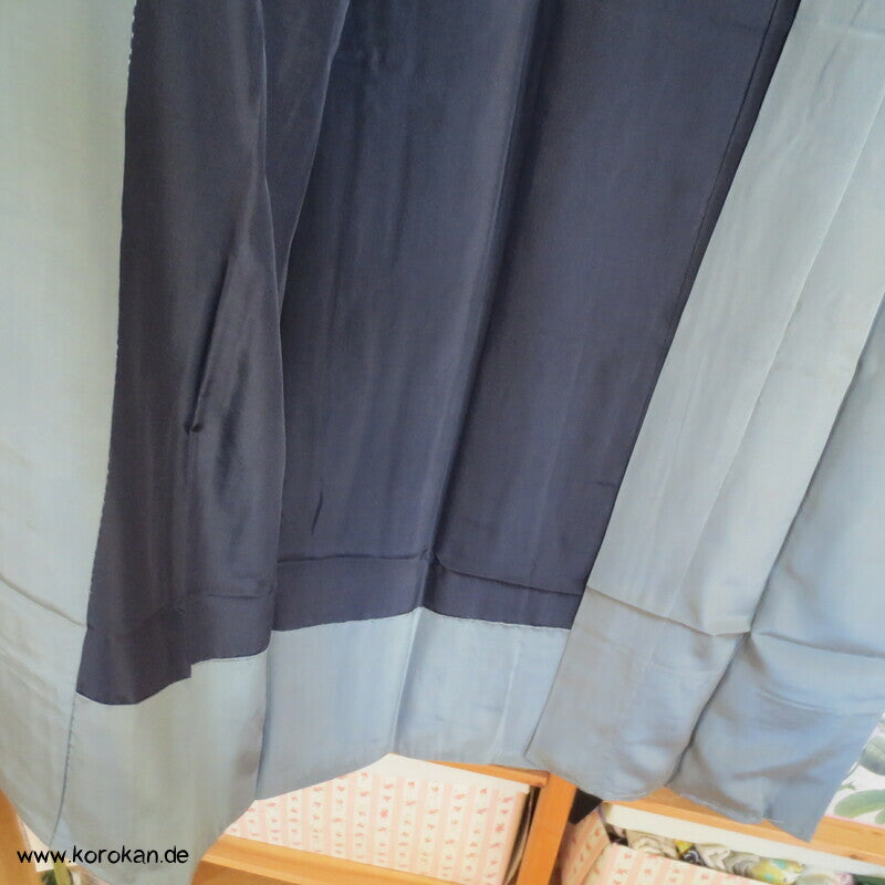 Vintage Männer Juban Unter Kimono, Farbverlauf Seidencrepe mit handgemaltem Schwert und Spiegel Insignien im Rücken, Künstlersignatur, voll gefüttert mit blassblauer Seide und einem dunkelblauen offen angenähten Han Eri Ripskragen.