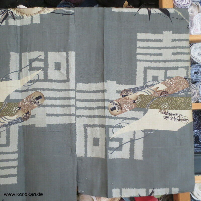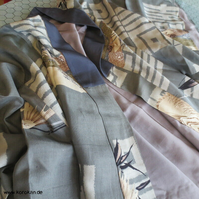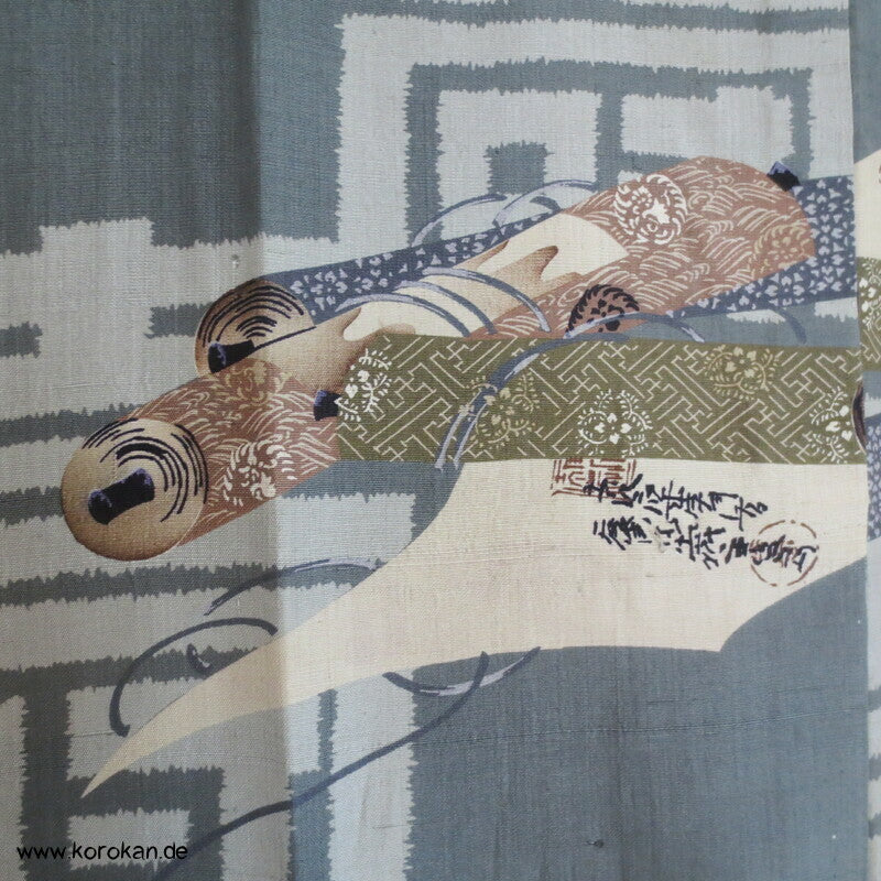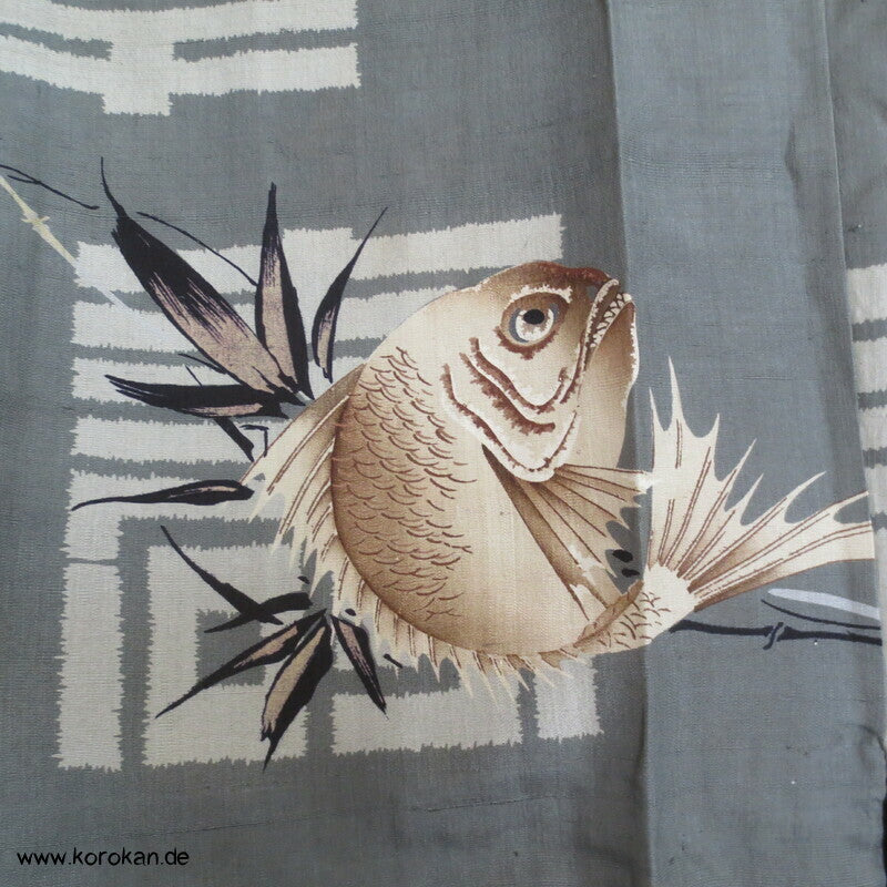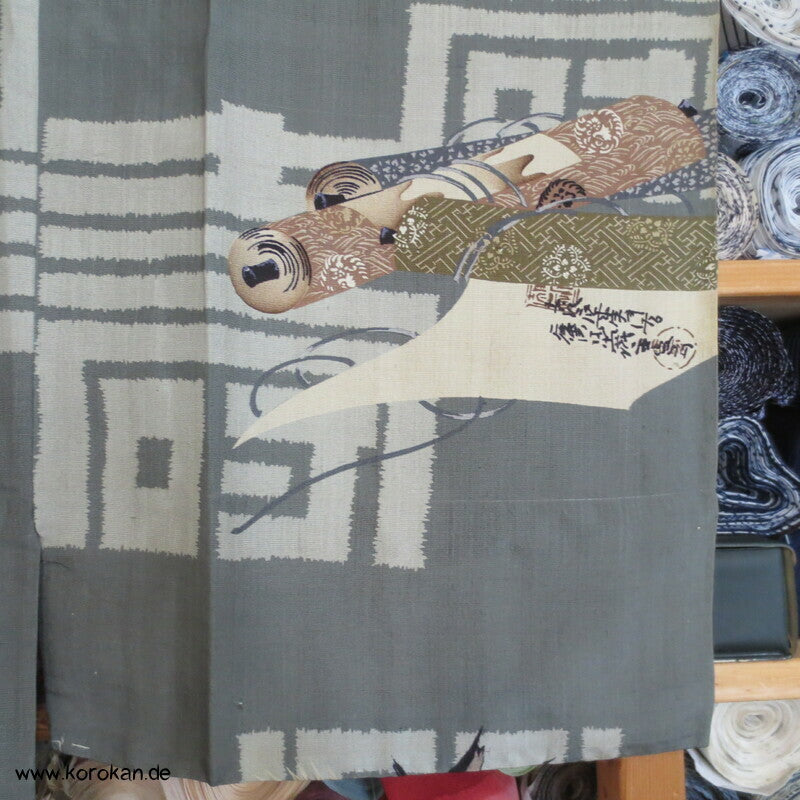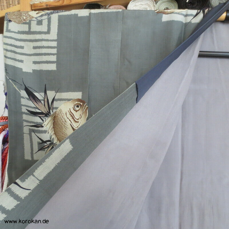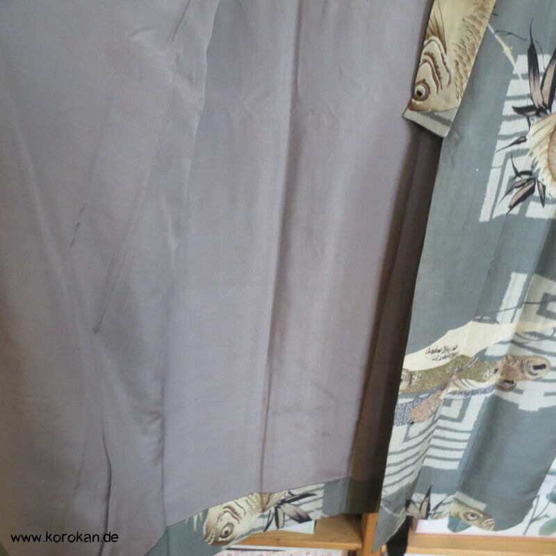 Vintage, eher schon antiker, ca. 1930'er Männer Juban Unterkimono aus feinem weichen Ramie / Seidentaft bedruckt mit Seebrassen, Emaki Bildrollen und Genjiko Symbolen auf graubeige, blauer Ripskragen, voll gefüttert