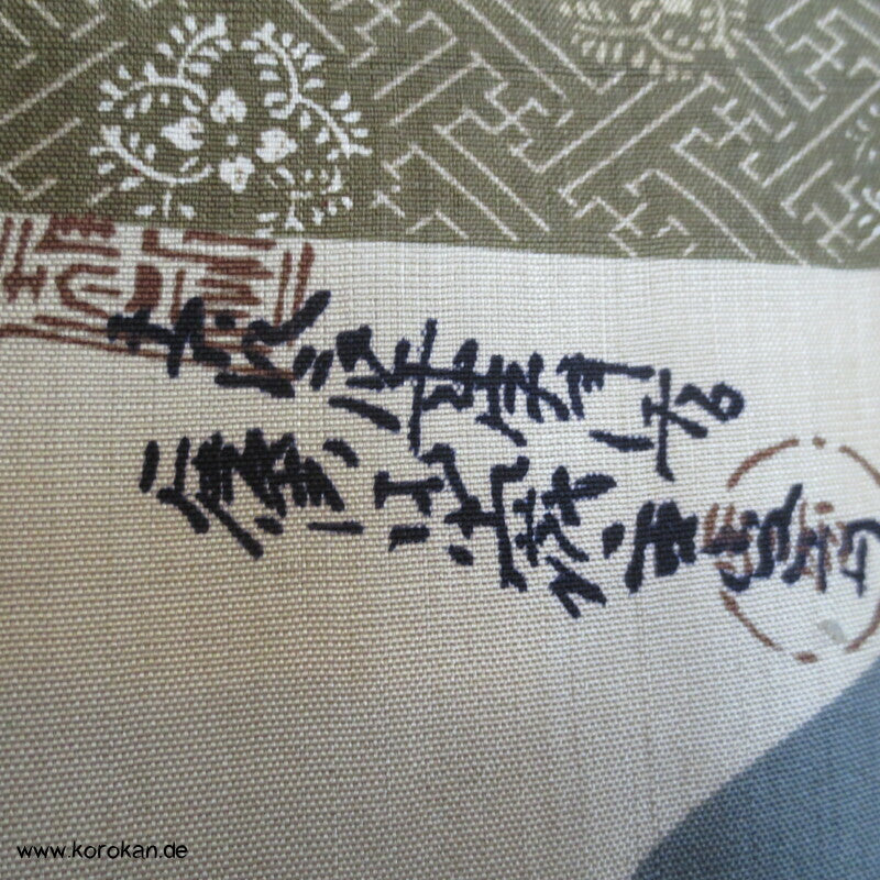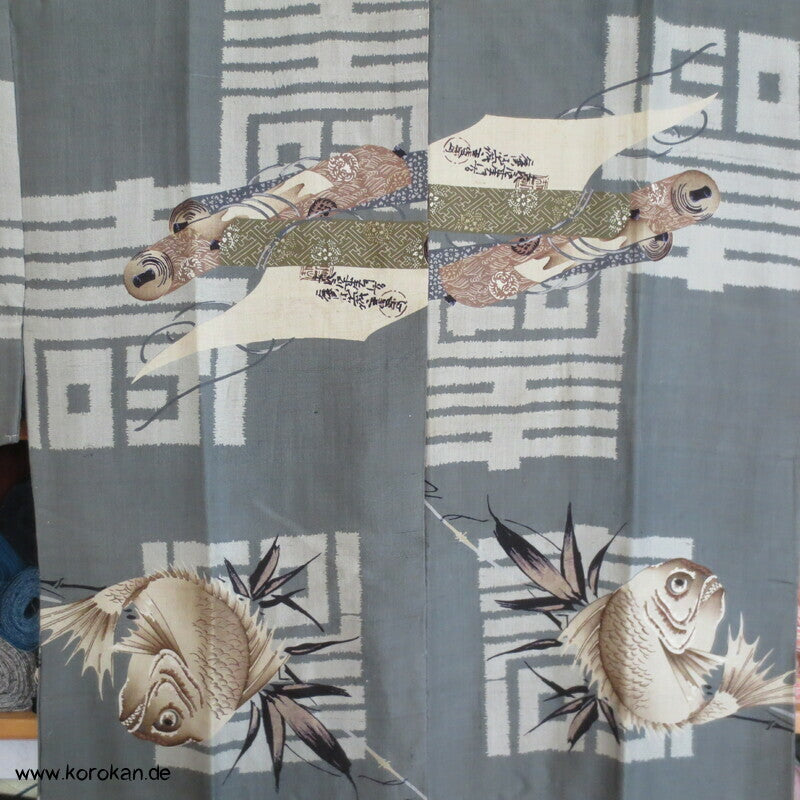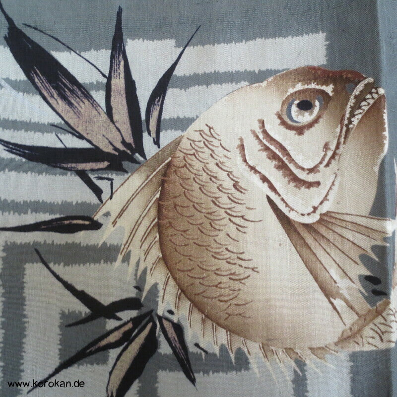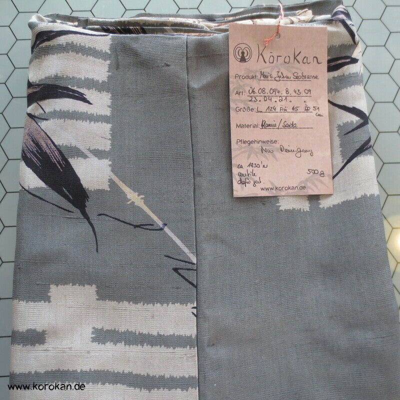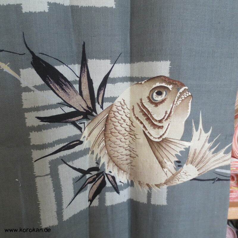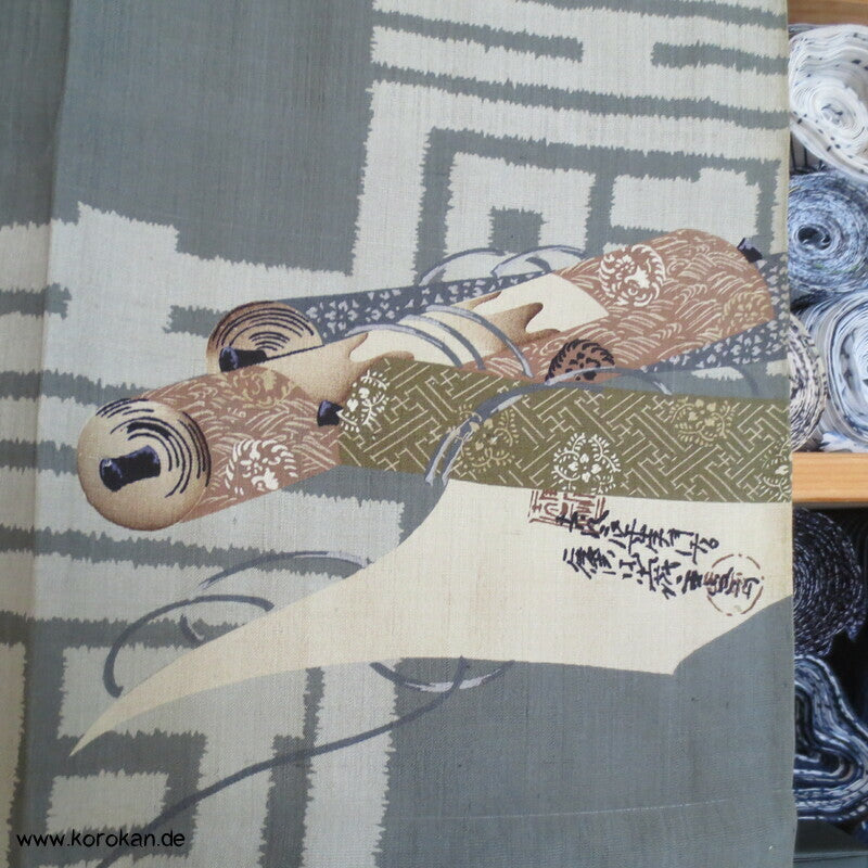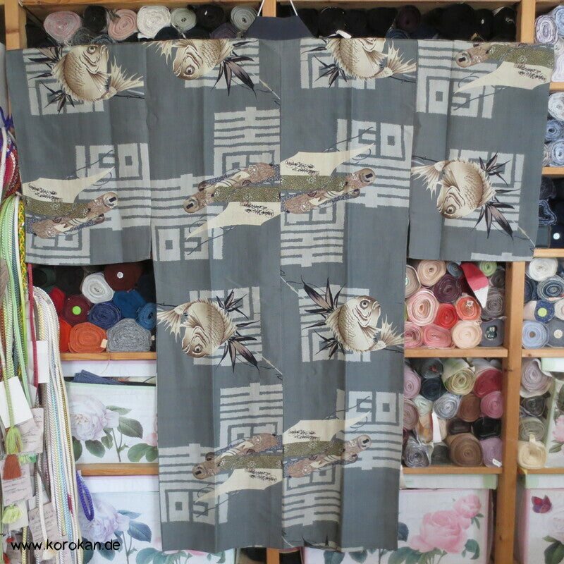 Vintage, eher schon antiker, ca. 1930'er Männer Juban Unterkimono aus feinem weichen Ramie / Seidentaft bedruckt mit Seebrassen, Emaki Bildrollen und Genjiko Symbolen auf graubeige, blauer Ripskragen, voll gefüttert