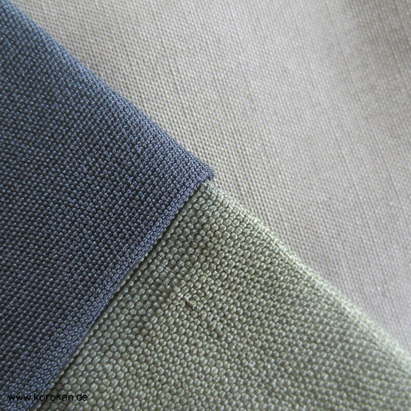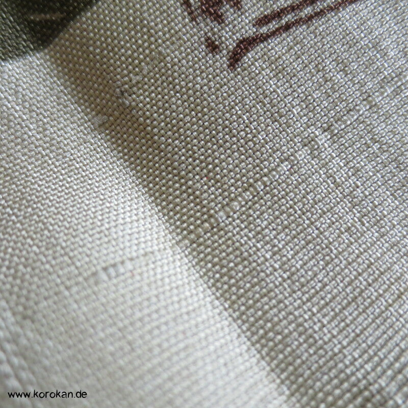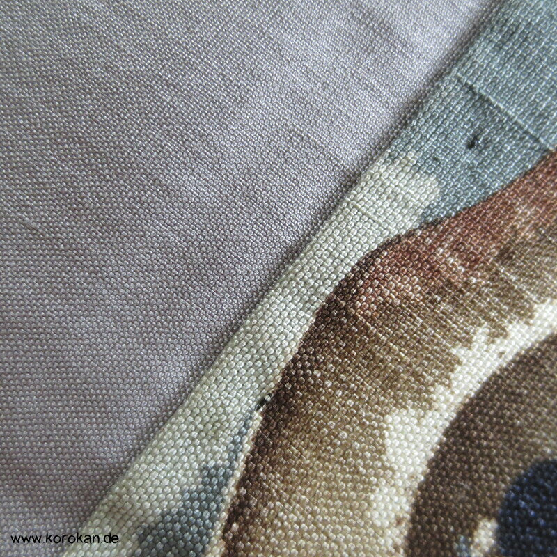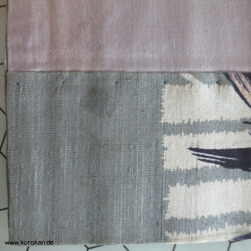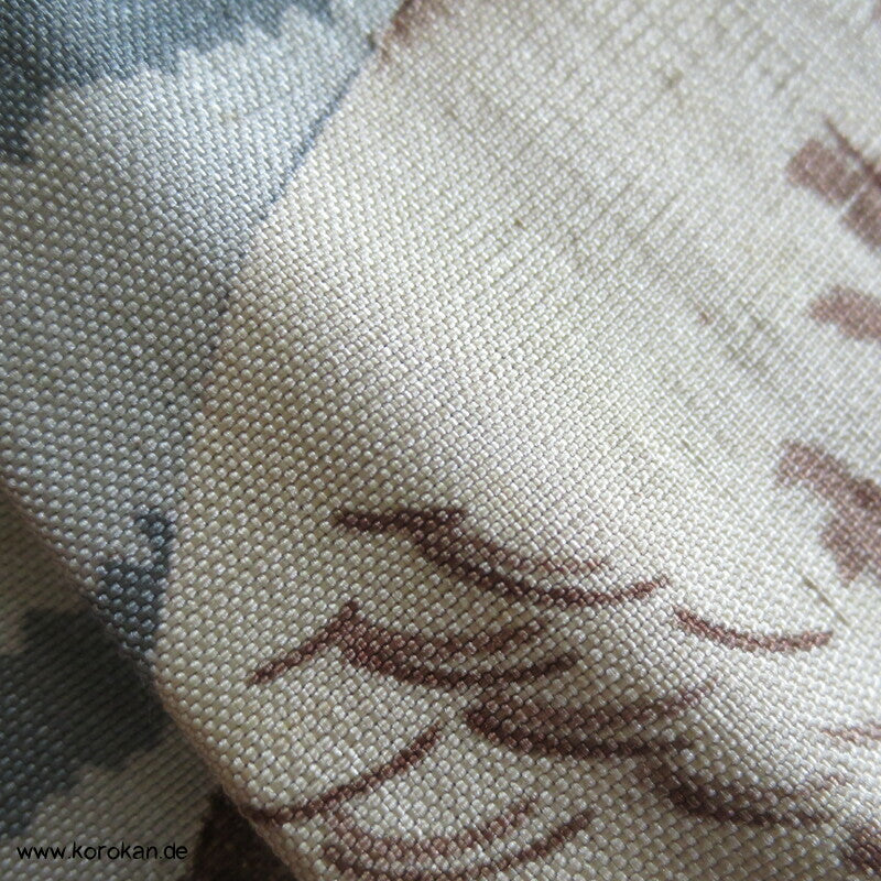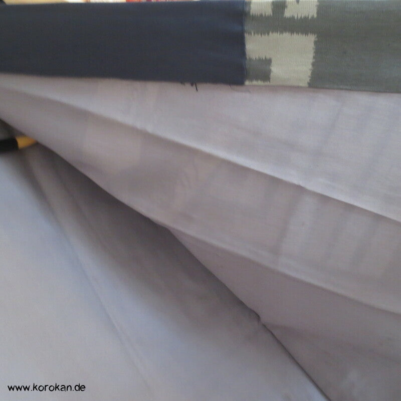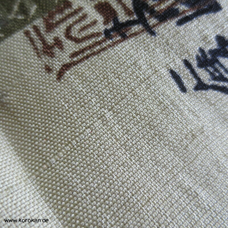Vintage, eher schon antiker, ca. 1930'er Männer Juban Unterkimono aus feinem weichen Ramie / Seidentaft bedruckt mit Seebrassen, Emaki Bildrollen und Genjiko Symbolen auf graubeige, blauer Ripskragen, voll gefüttert
