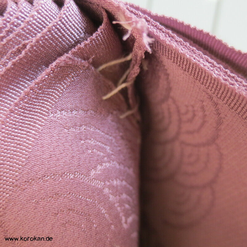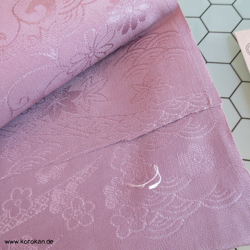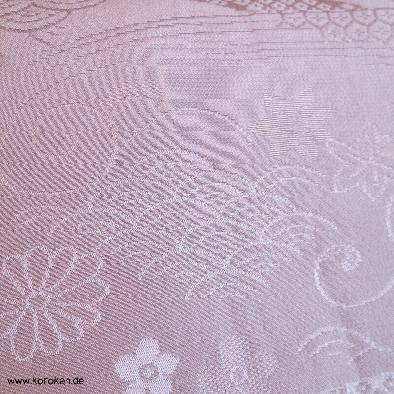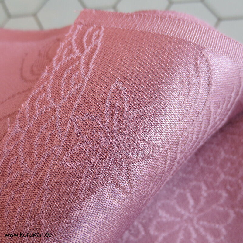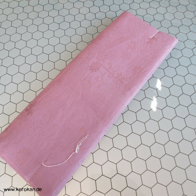 japanische Vintage aufgetrennter, zusammengenähter, frisch gewaschener Kimono Seide Stoffrolle rosa Damast mit gewebten Ahornblättern, Bambus, Blüten etc... sehr fein und edel