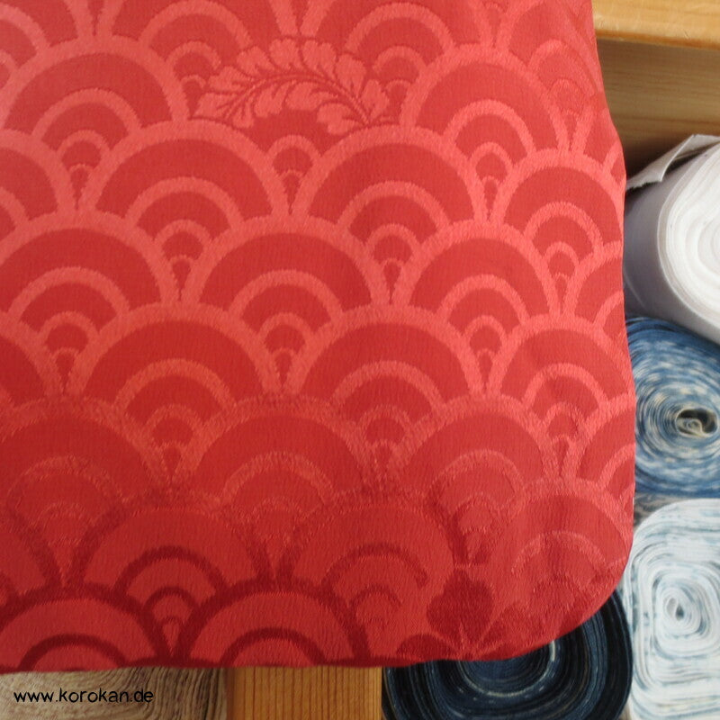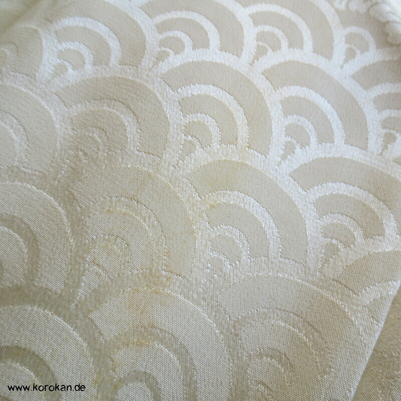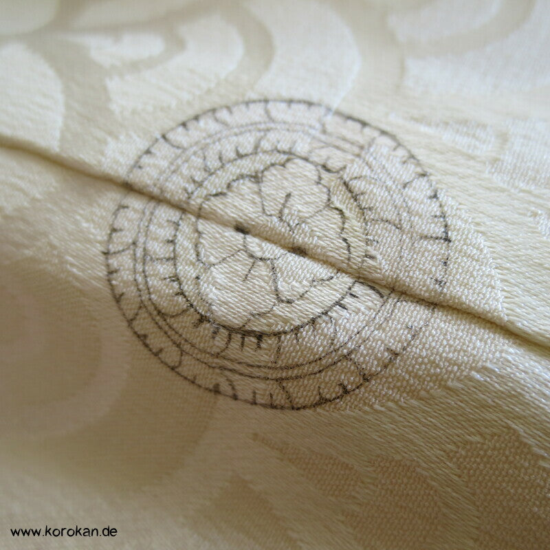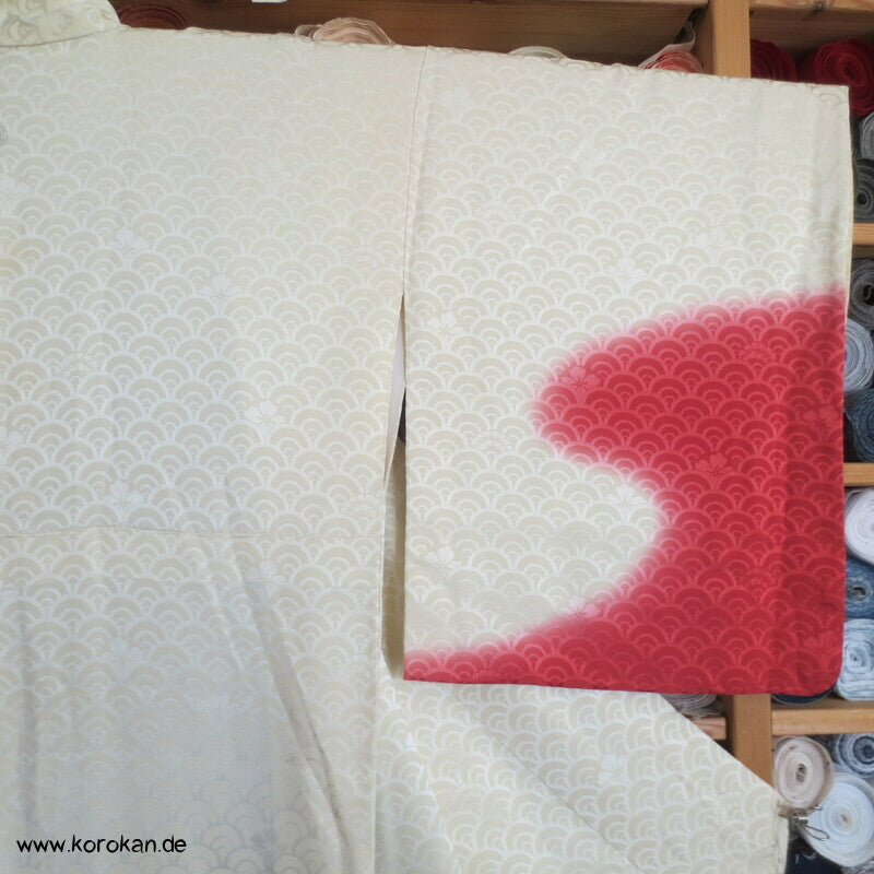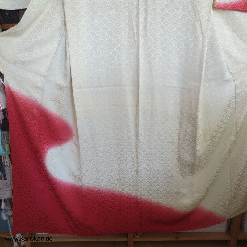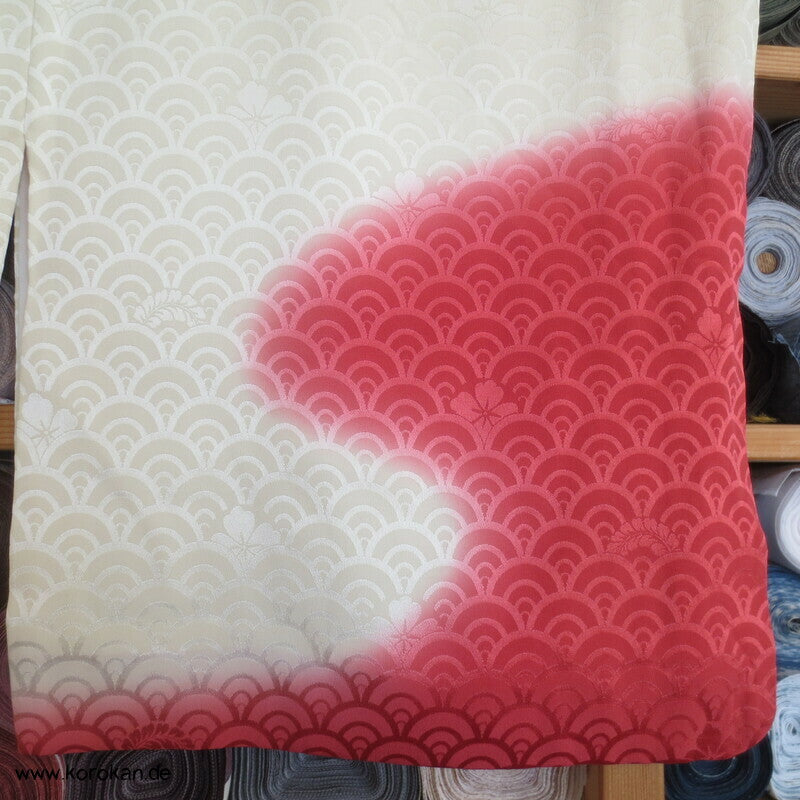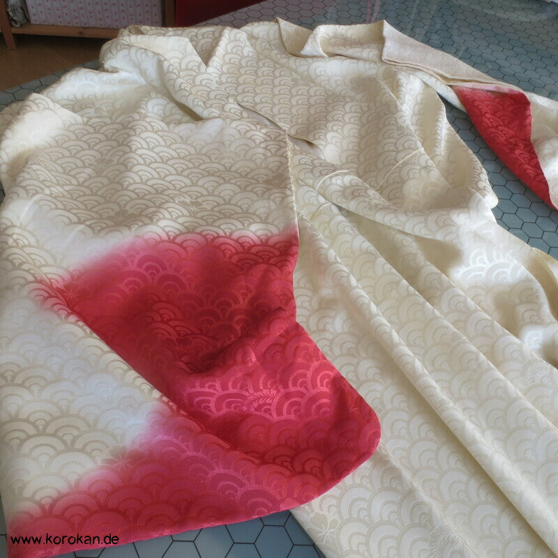 japanischer Vintage Homongi Kimono Schneegestöber Seidendamast mit großen Chrysanthemenmustern gestickt über Shibori Wolken, oberem hellen, stark wolkig nachgedunkeltem Seiden Futter und unterem Hakkake Futter Seidencrepe mit Bokashi Verlaufsrand in rot.