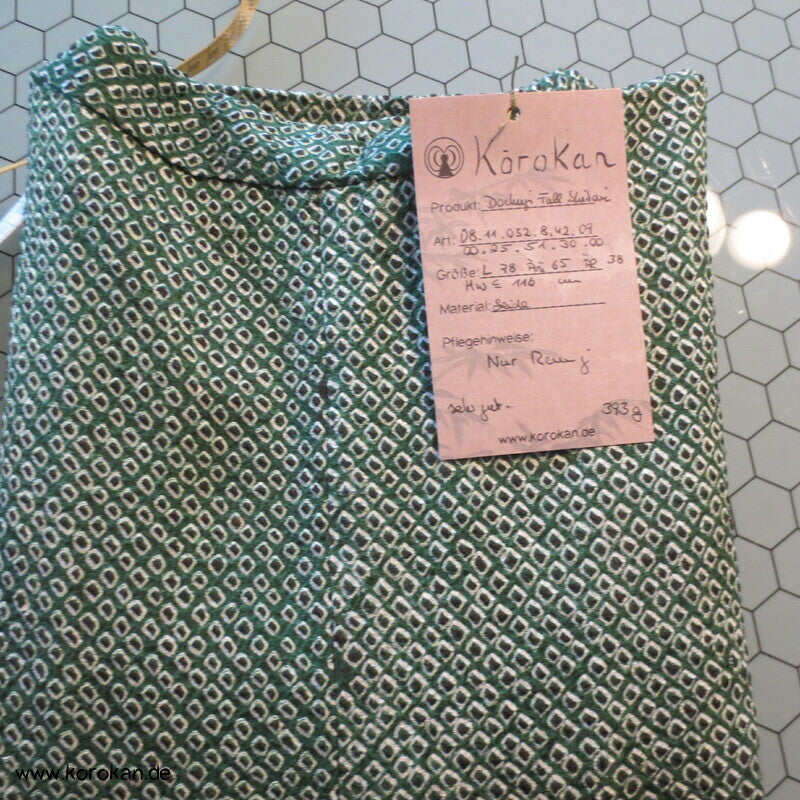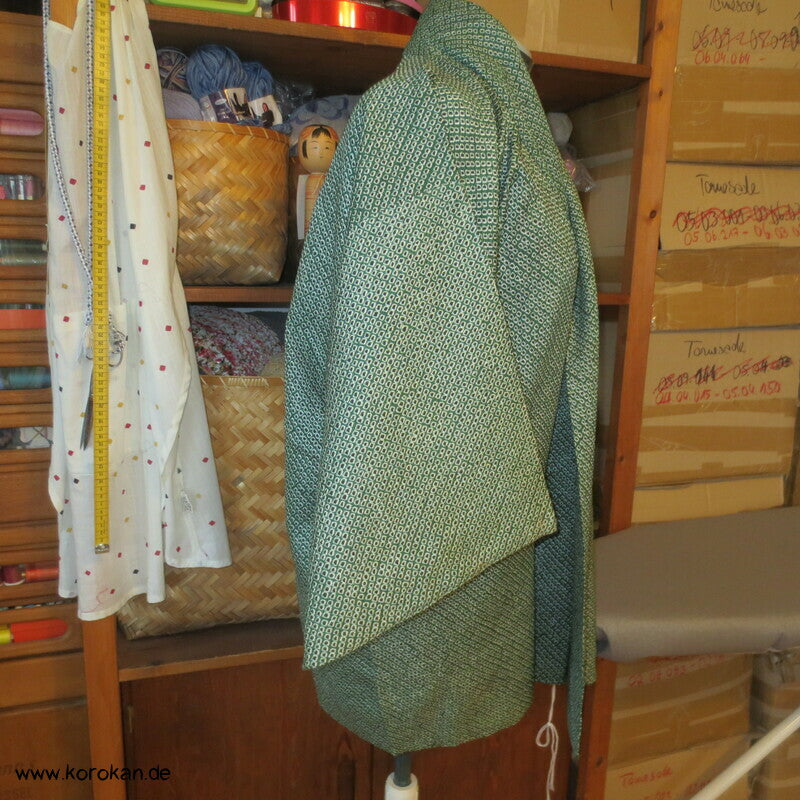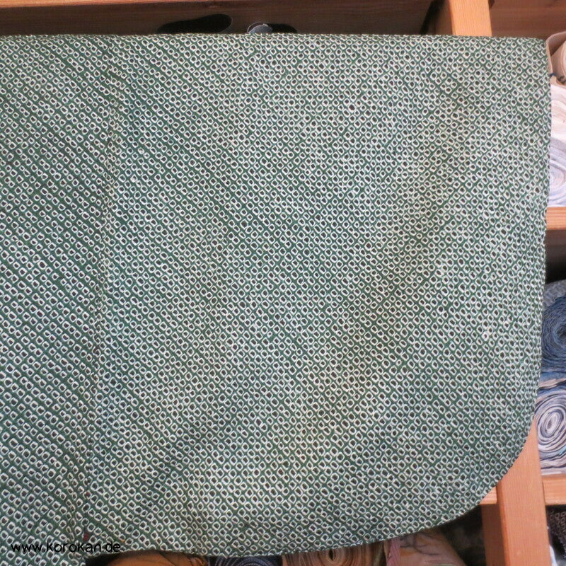 Vintage Dochugi Kimono Jacke aus feiner Seide Full Shibori allover Kanoko Punkte in grün mit dunkelgrünem Punkt mit bedrucktem oberen Seidenfutter.
