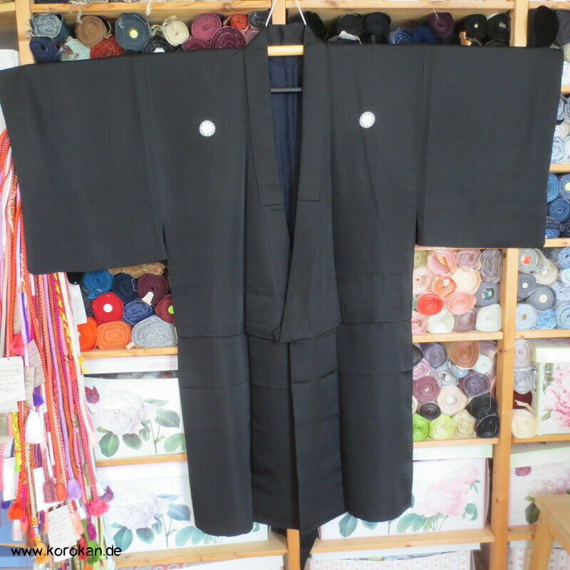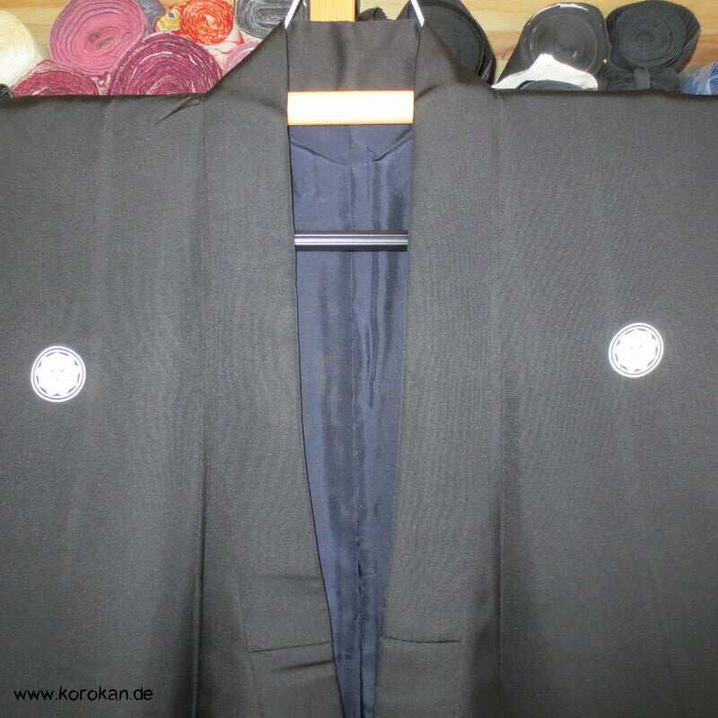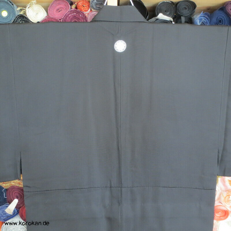 Vintage Männer Honan Seiden schwarzer formeller Kimono, mit 5 Mon, Futter schwarze Seide, sehr fein, tiefe Falte in der Taille eingelegt