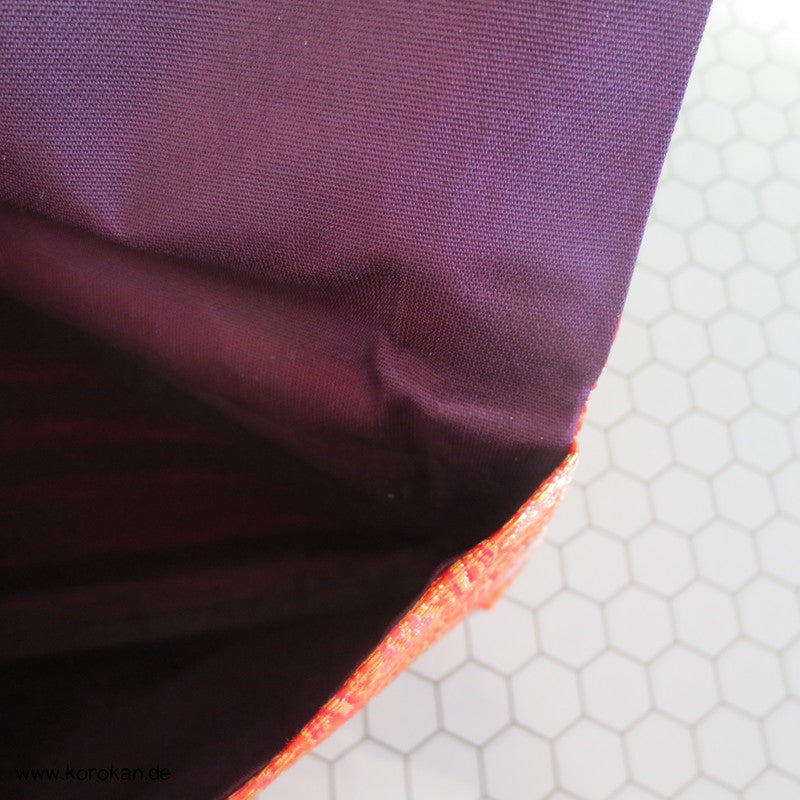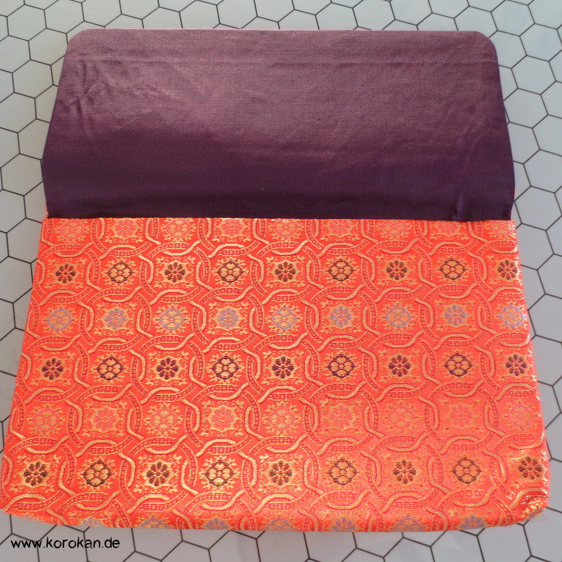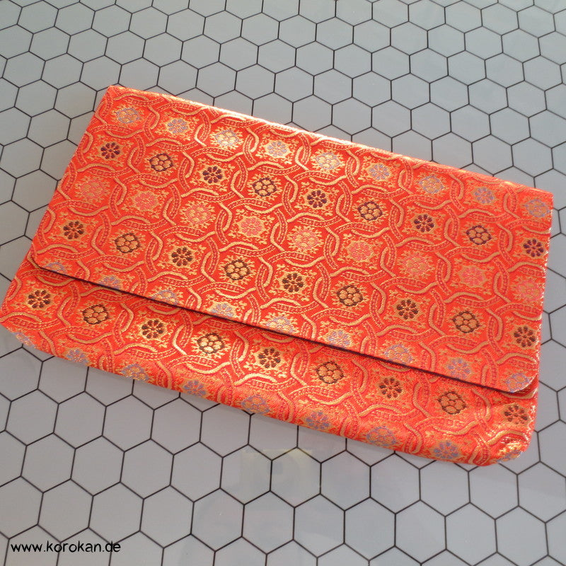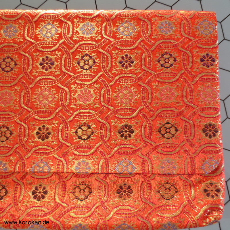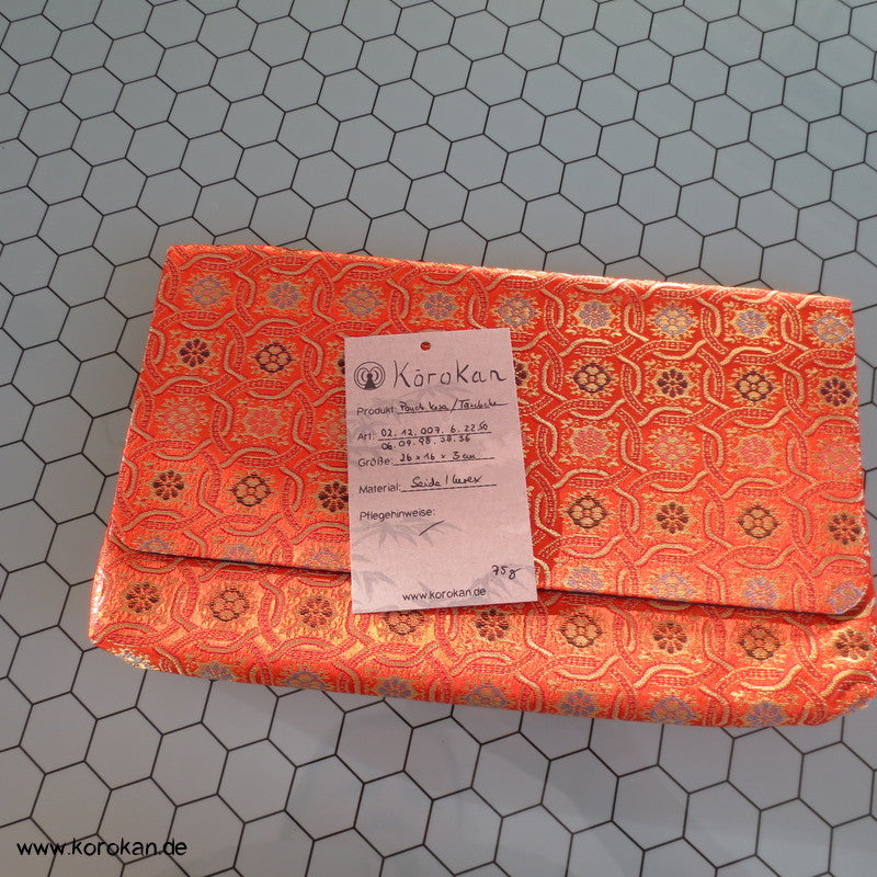 japanische Vintage unbenutzte Clutch Handtasche aus feinem Seidenbrokat mit sich überlappenden Ringen auf orange