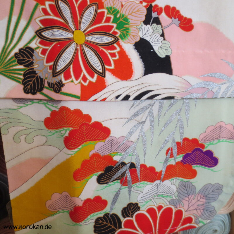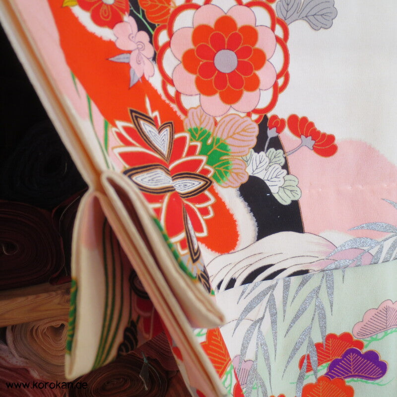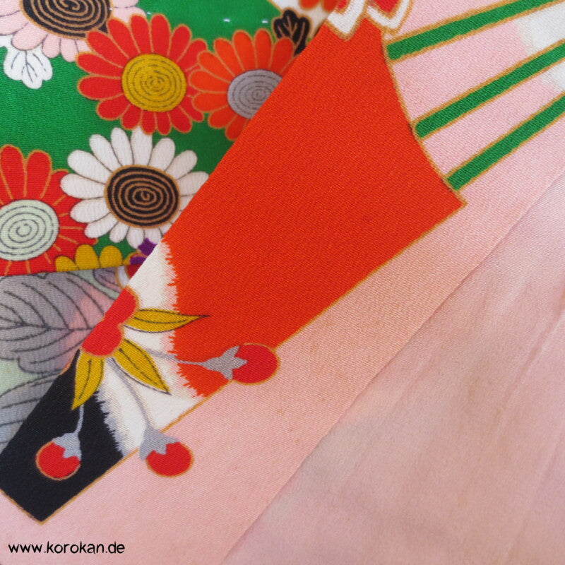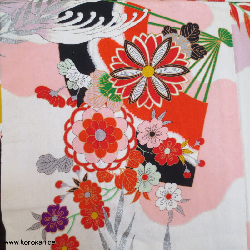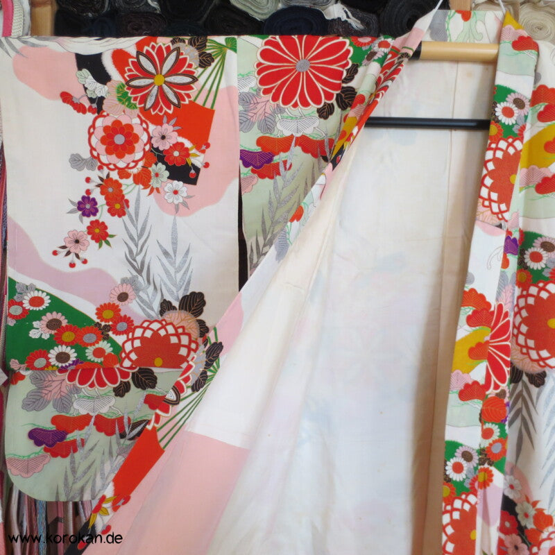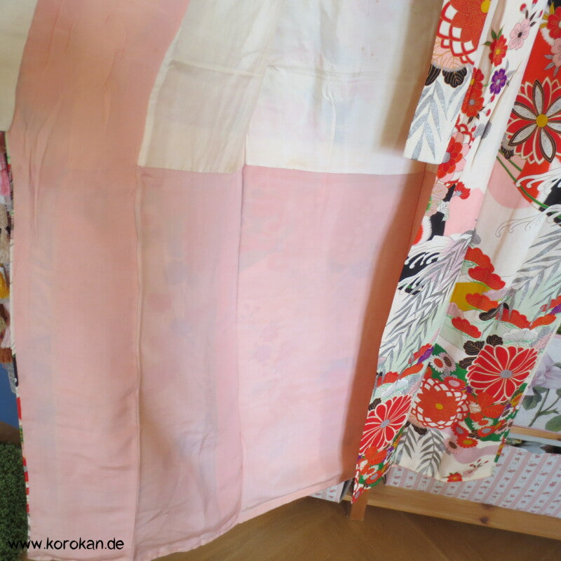 Vintage, eher antiker Furisode wildbunter Blüten Seidencrepe Kimono, oberes Futter helle Seide, unteres Hakkake Seidenfutter Obermaterial in rosa