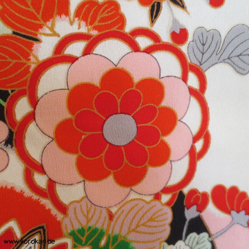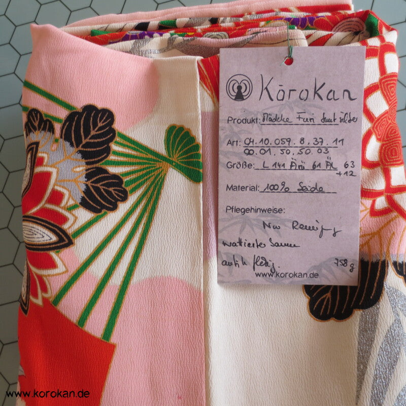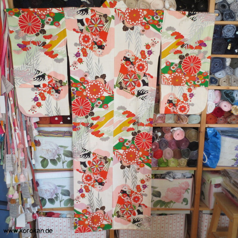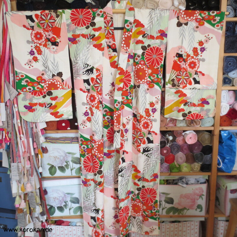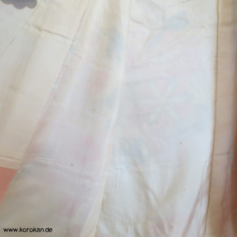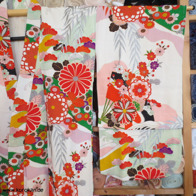 Vintage, eher antiker Furisode wildbunter Blüten Seidencrepe Kimono, oberes Futter helle Seide, unteres Hakkake Seidenfutter Obermaterial in rosa