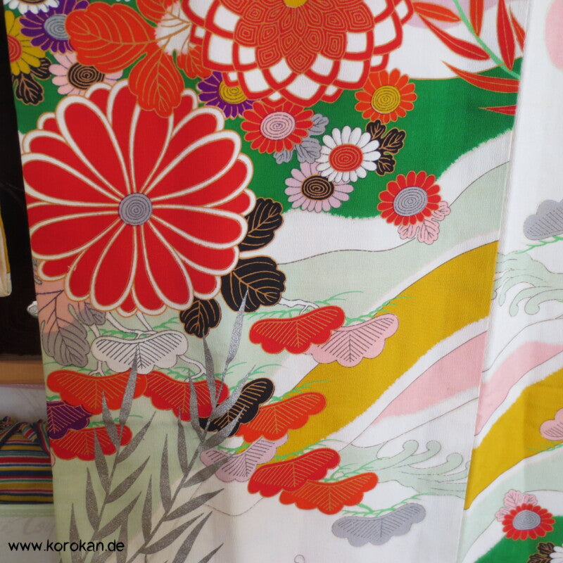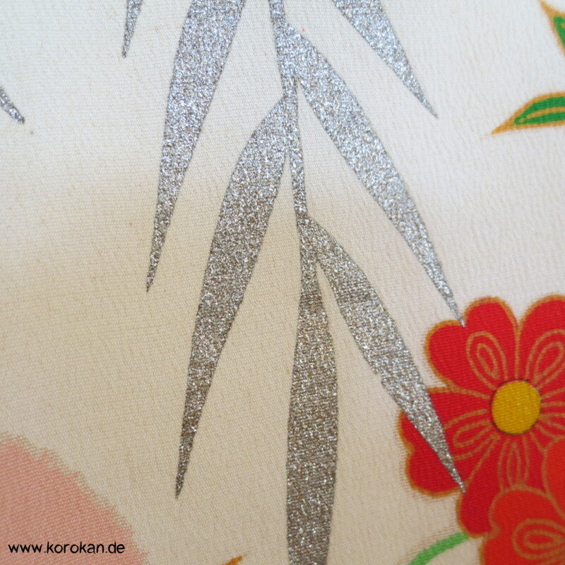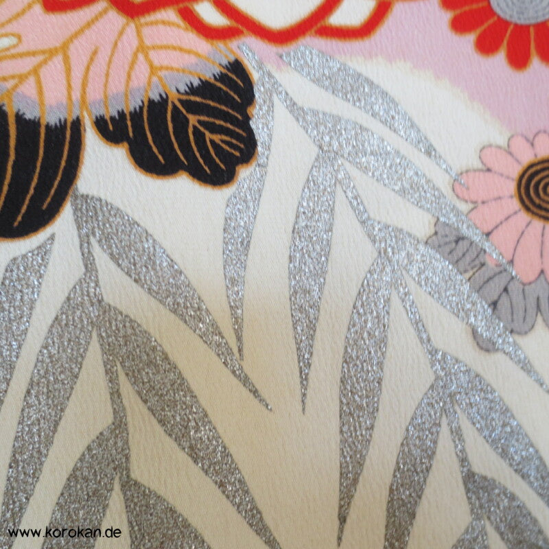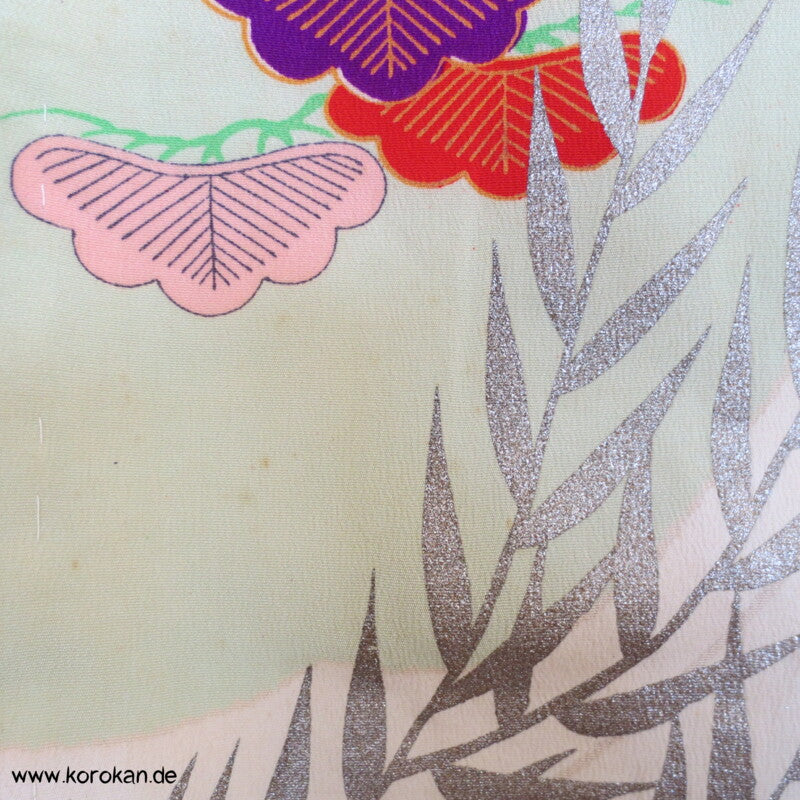 Seidencrepe Furisode Kimono - silberne Blätter und bunte Muster