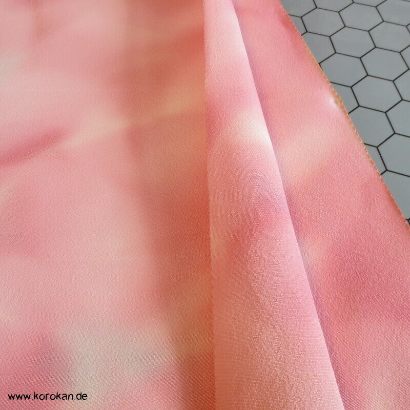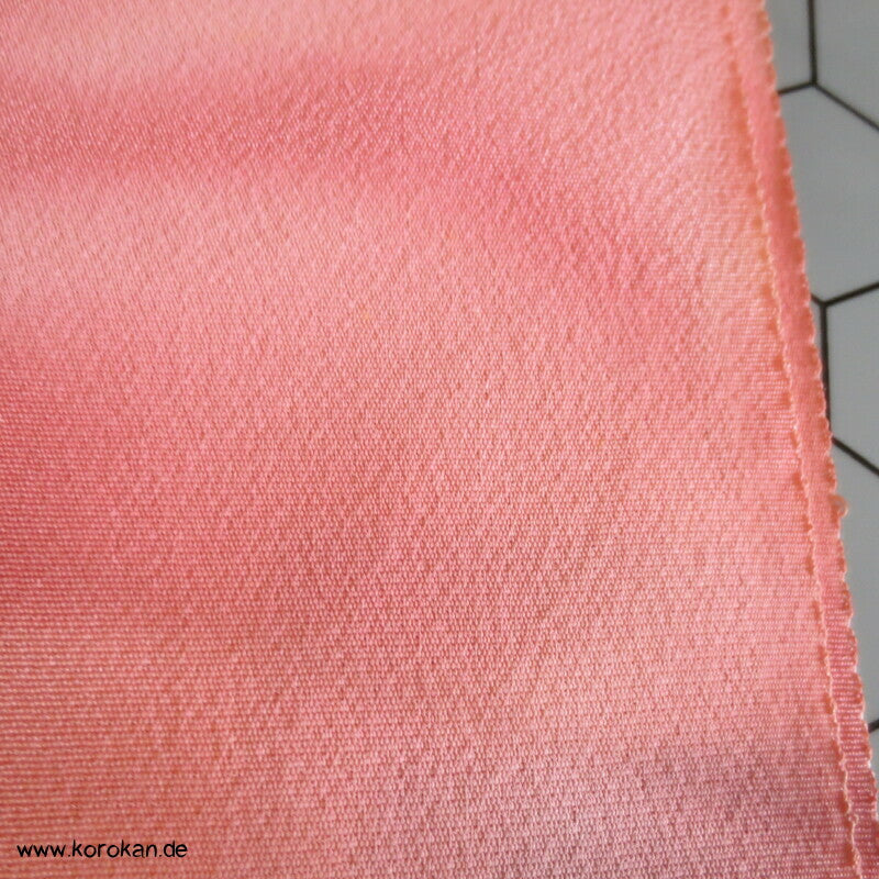 Vintage unbenutzter japanischer Stoffballen Crepe Seide, bemalt mit zarten Blättern in altrosa Farbverläufen. Das Muster ist unregelmäßig im Stoff verteilt.