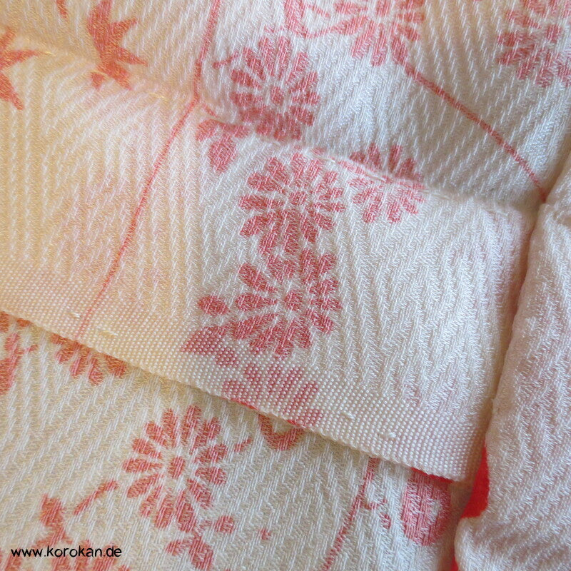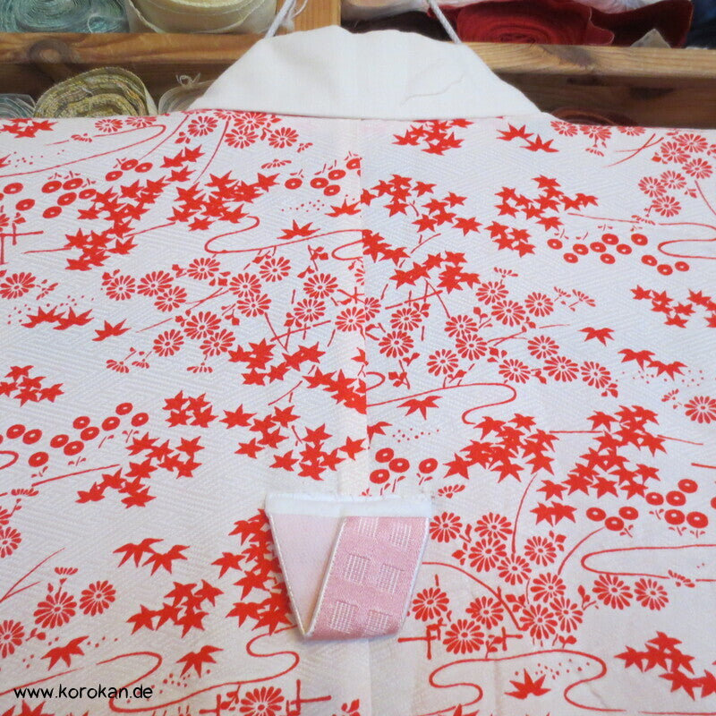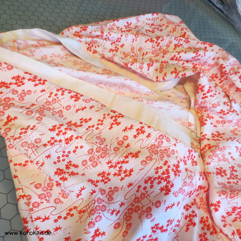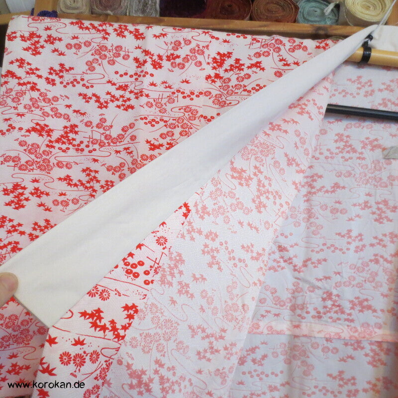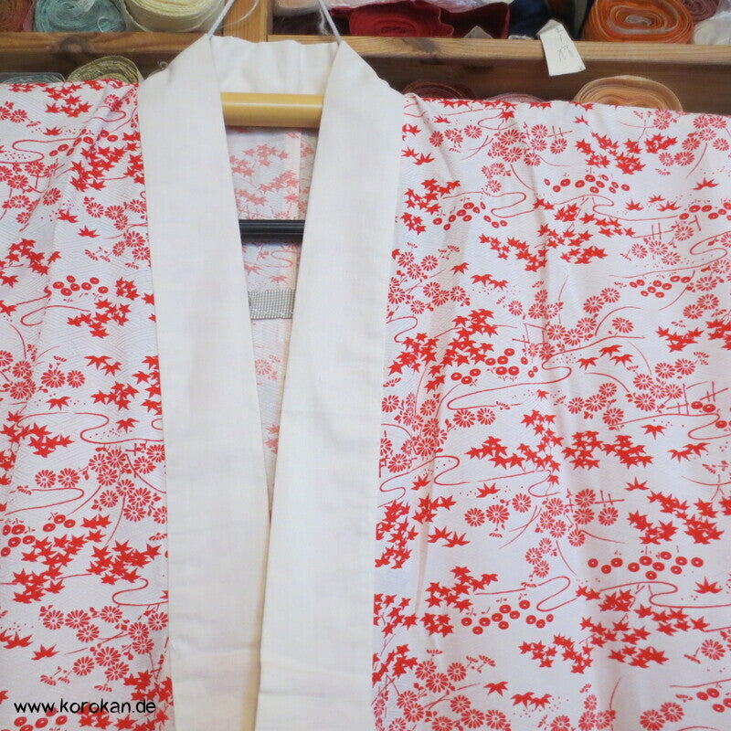 Vintage ungefütterter Juban Unter Kimono Seidendamast mit zartem Gartenlandschafts Muster, natur - rot, hellem Baumwoll Unter Kragen
