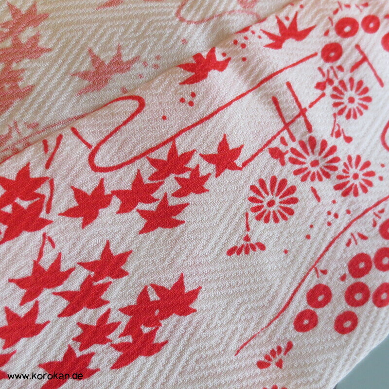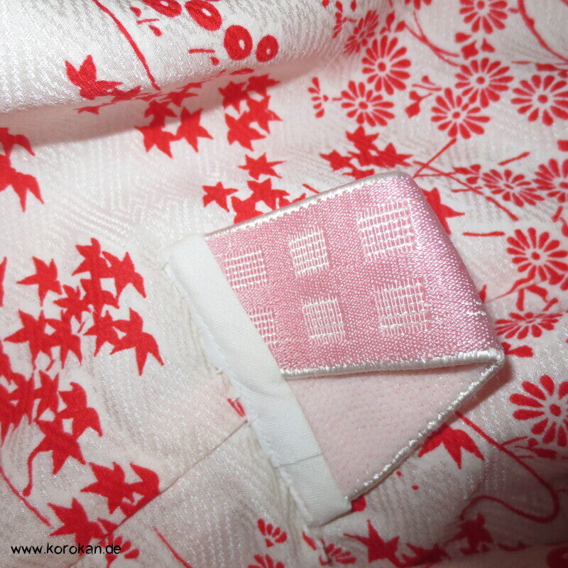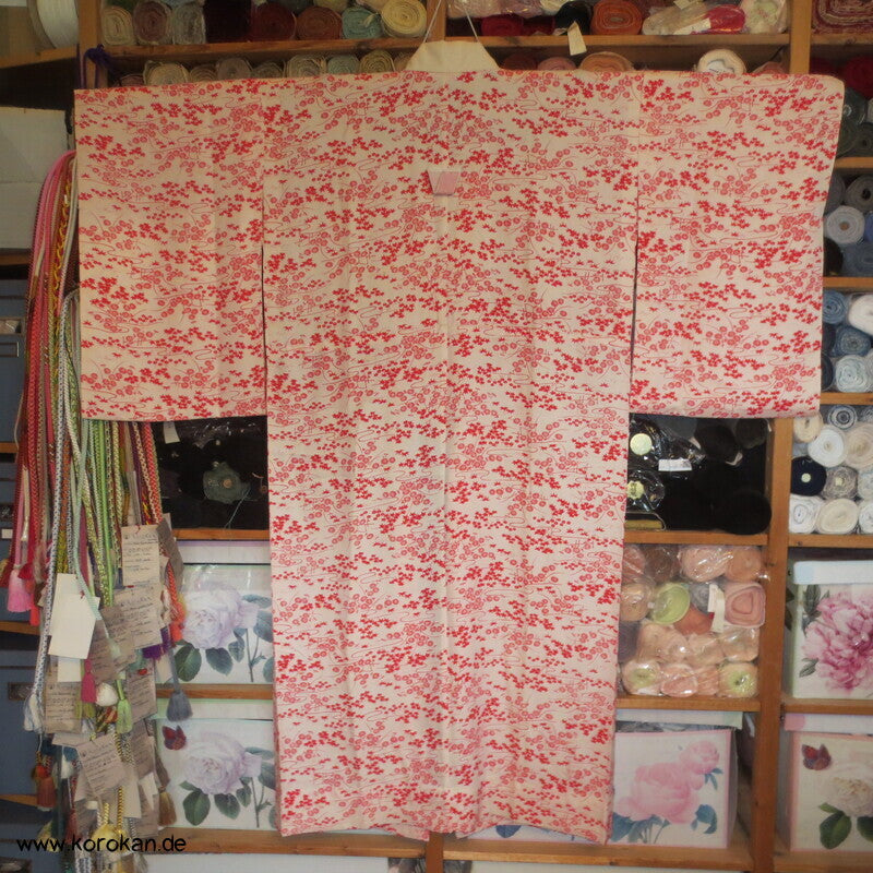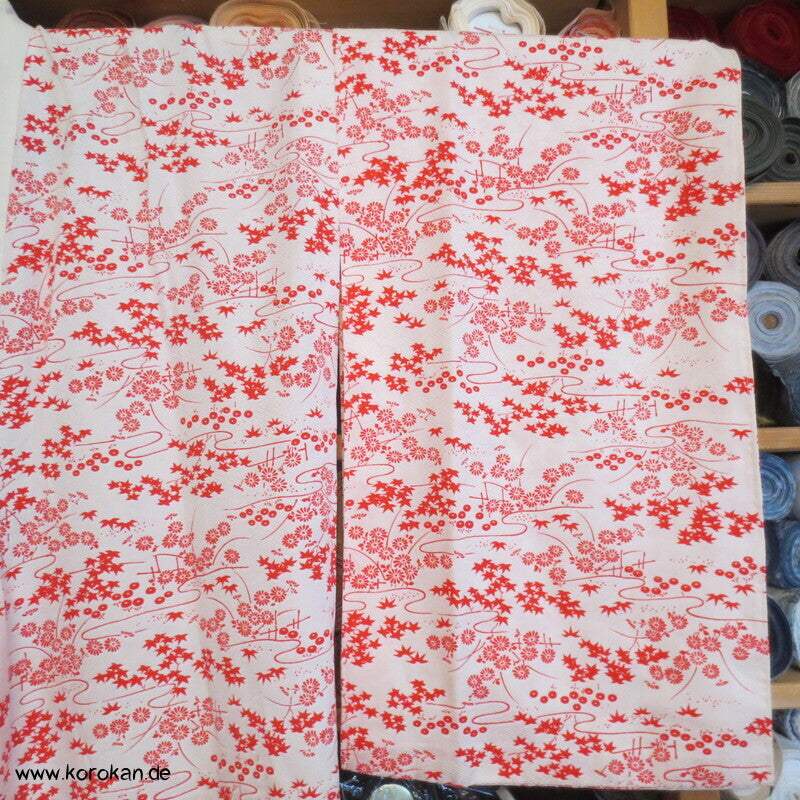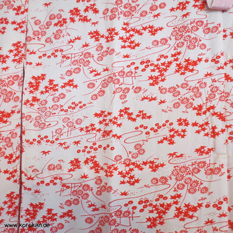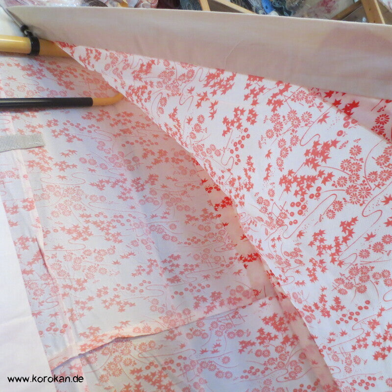 Vintage ungefütterter Juban Unter Kimono Seidendamast mit zartem Gartenlandschafts Muster, natur - rot, hellem Baumwoll Unter Kragen