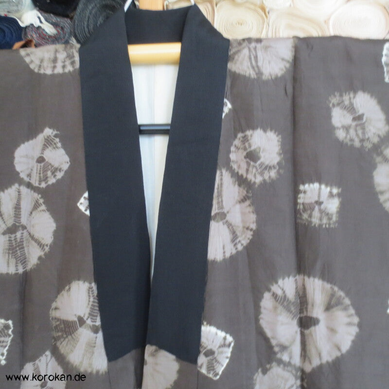 Vintage dick gepolsterter Männer Juban Unter Kimono, Seidenpongé mit großem Binde Shibori Kreisen und einem dunkelblauen Han Eri Ripskragen, voll gefüttert und gepolstert auf Seide.