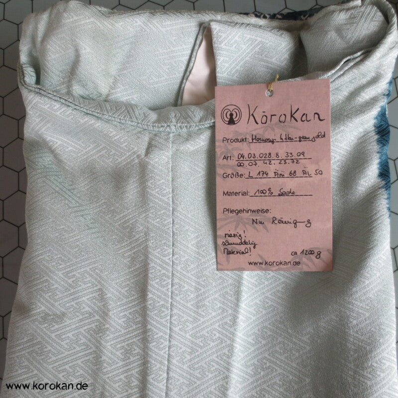 Shibori Bögen blaugrau blau gold Homongi Seiden Araihari Kimono