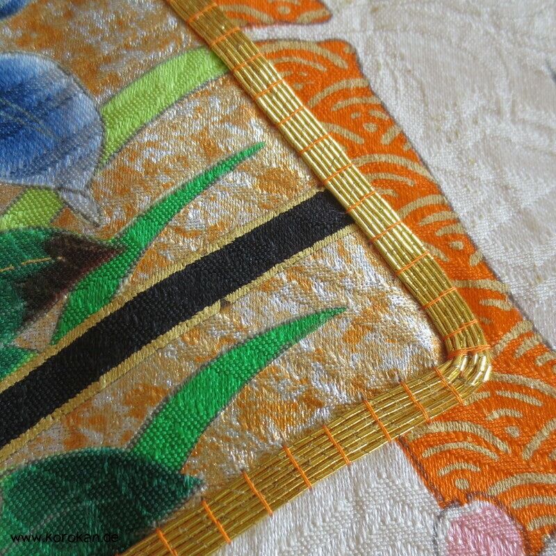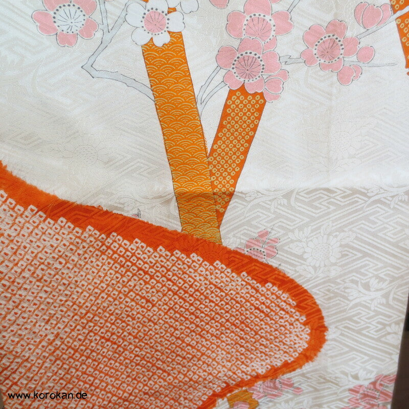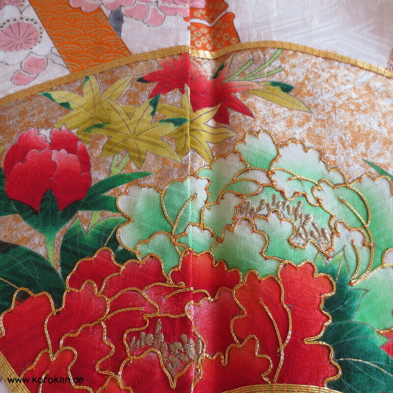 Vintage Furisode Sayagata Seidendamast Kimono mit Fächern, Bambusstäben, Päonien, viel Gold und silber Druck, goldbestickt, oberes Futter helle Seide, unteres Hakkake Seidenfutter mit Bokashi Farbverlaufsrand in orange auf Damast.