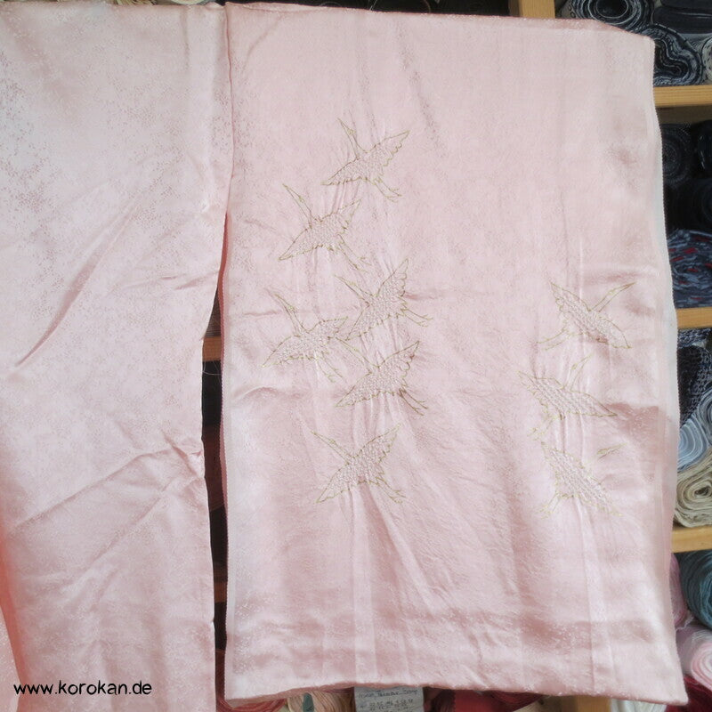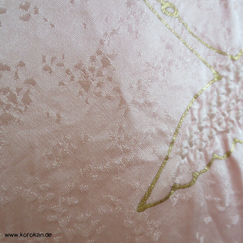handgemachte Shibori Kraniche mit Gold umrandet auf rosa Schneegestöber Damast