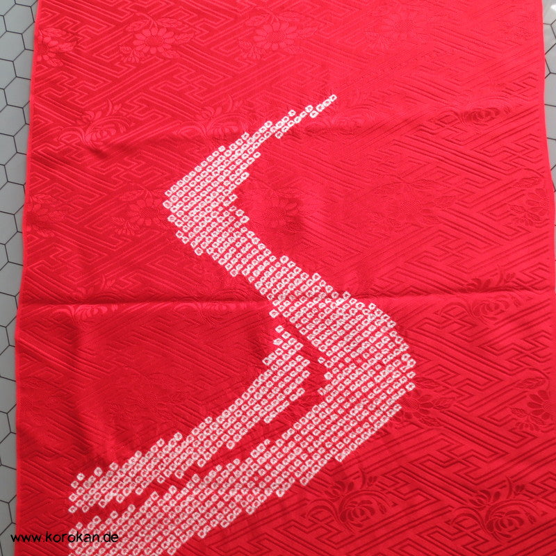 Vintage unbenutzte Kimono Seide Stoffrest mit Shibori Wellen und kleinen Wellenstreifen mit angedeuteten Blätter auf einem knallroten Sayagata Damast. Wohl für einen Furisode Juban Unterkimono