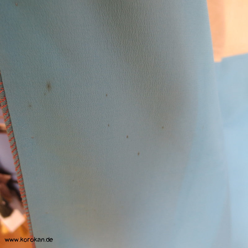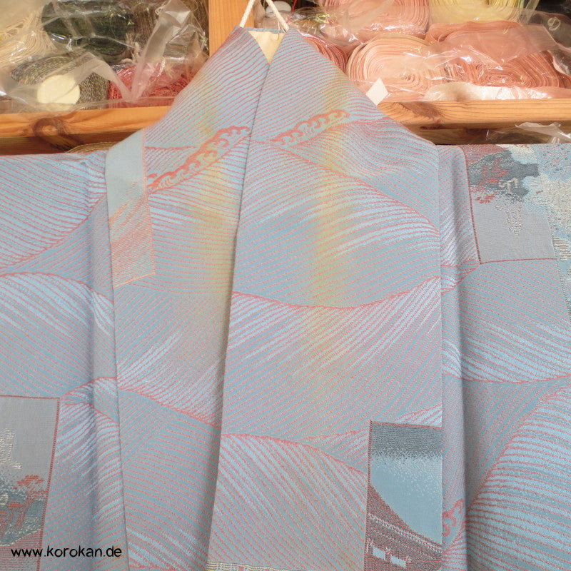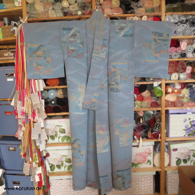 Vintage, japanischer 1950'er, eher antiker Komon Kimono Seiden Jacquard mit eingewebten silber und Urushi Shikishi Bildern in blaugrauer Seide mit Wellenmustern, oberen hellen Seiden Futter und unterem Hakkake Futter Seidencrepe azur
