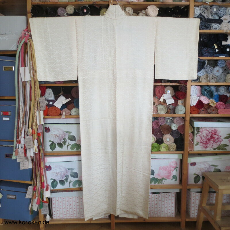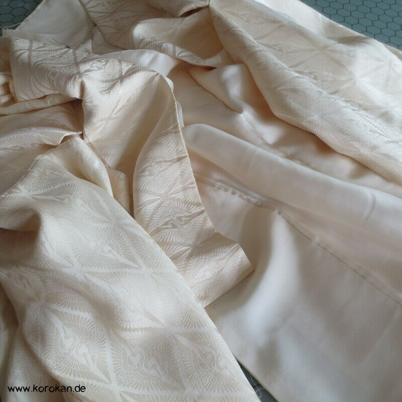 japanischer Vintage Shiromuku Hochzeits Iromuji Kimono aus feinstem hellen Seidendamast mit Kranichpaar Diamantrauten, hellem Seidenfutter oben und unten.