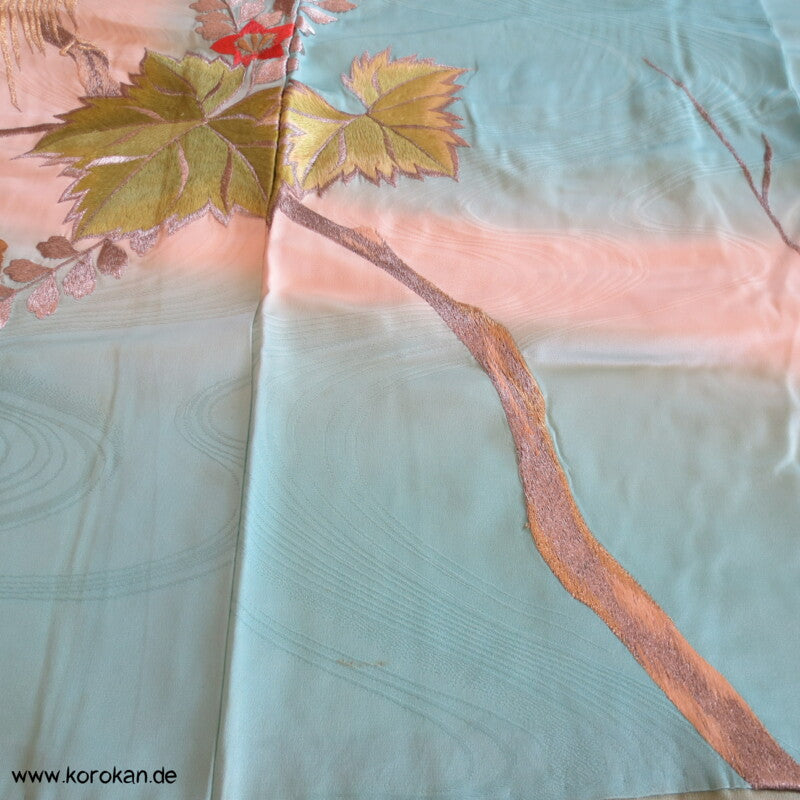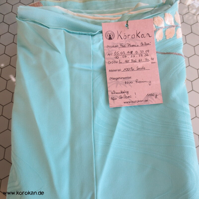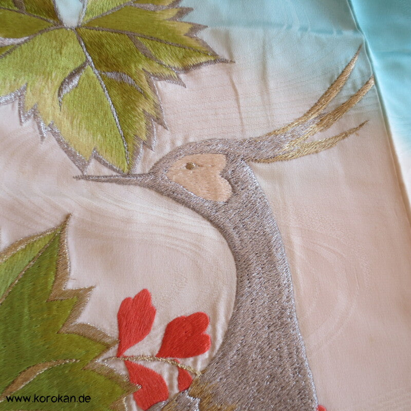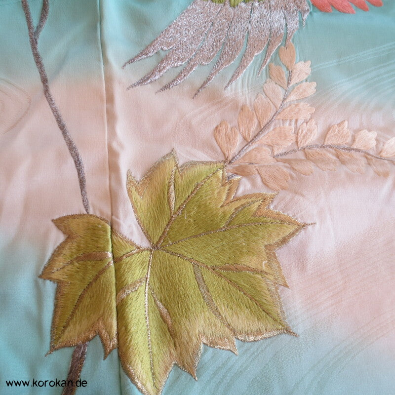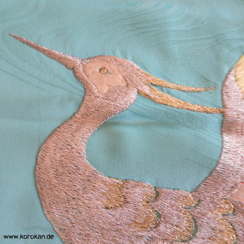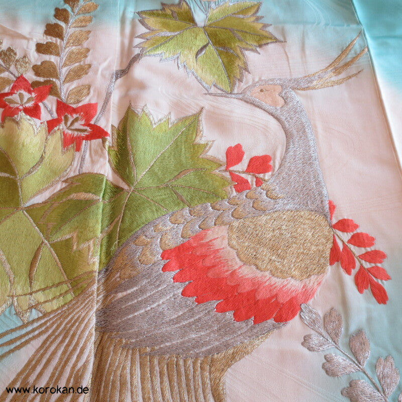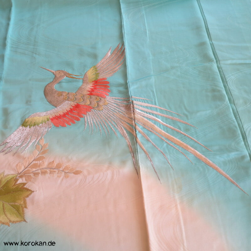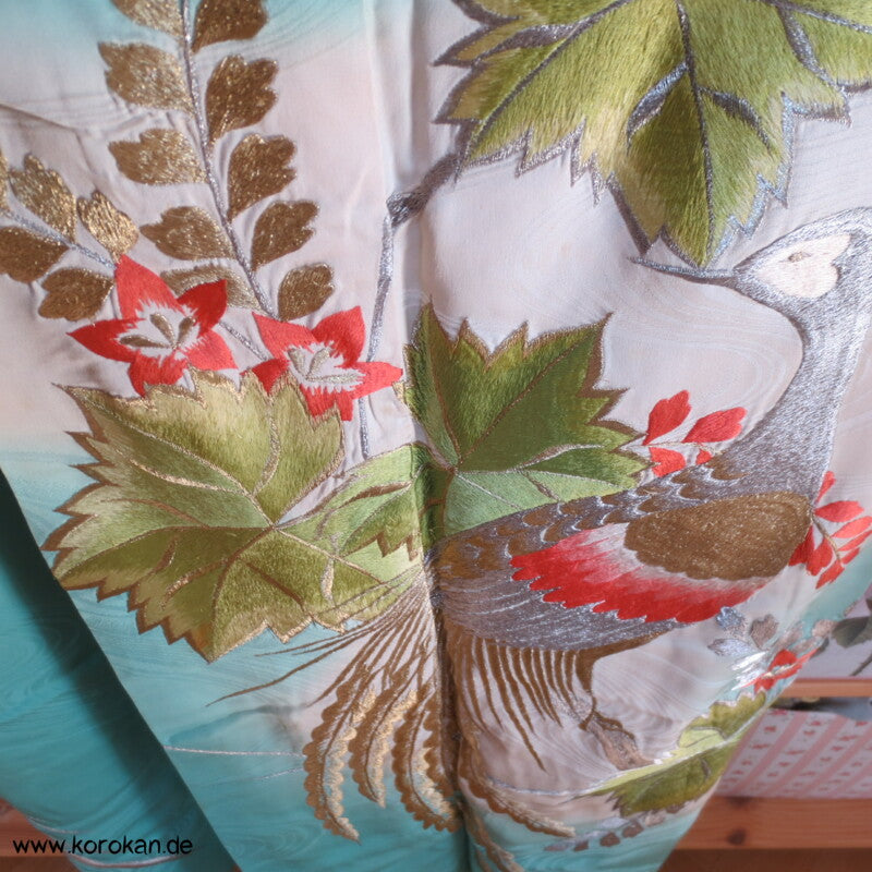 silberne Phönixstickerei auf türkisblauem Seidendamast Furisode