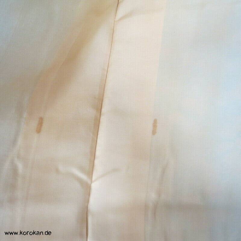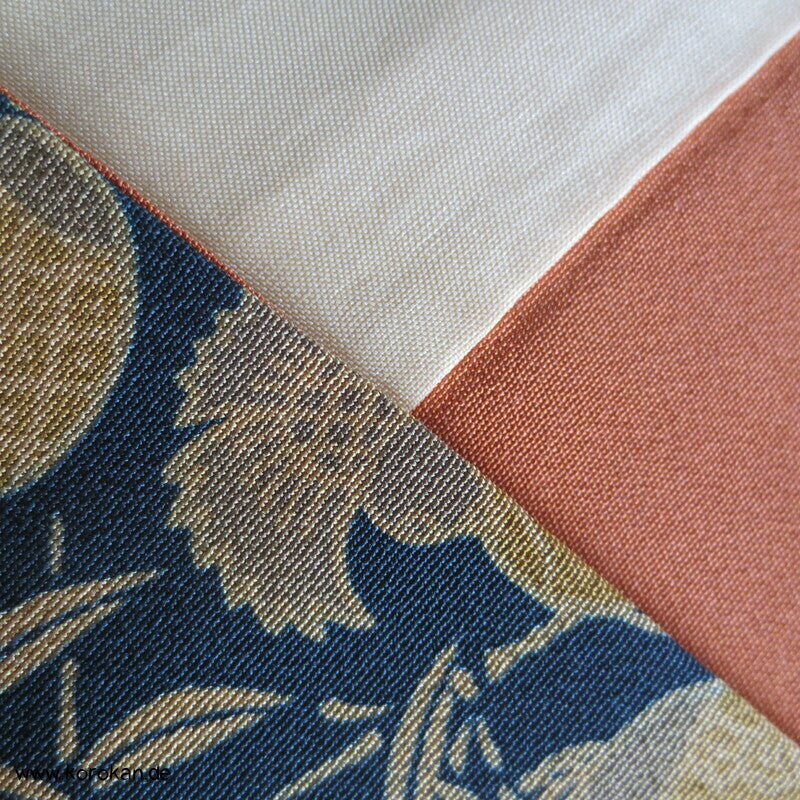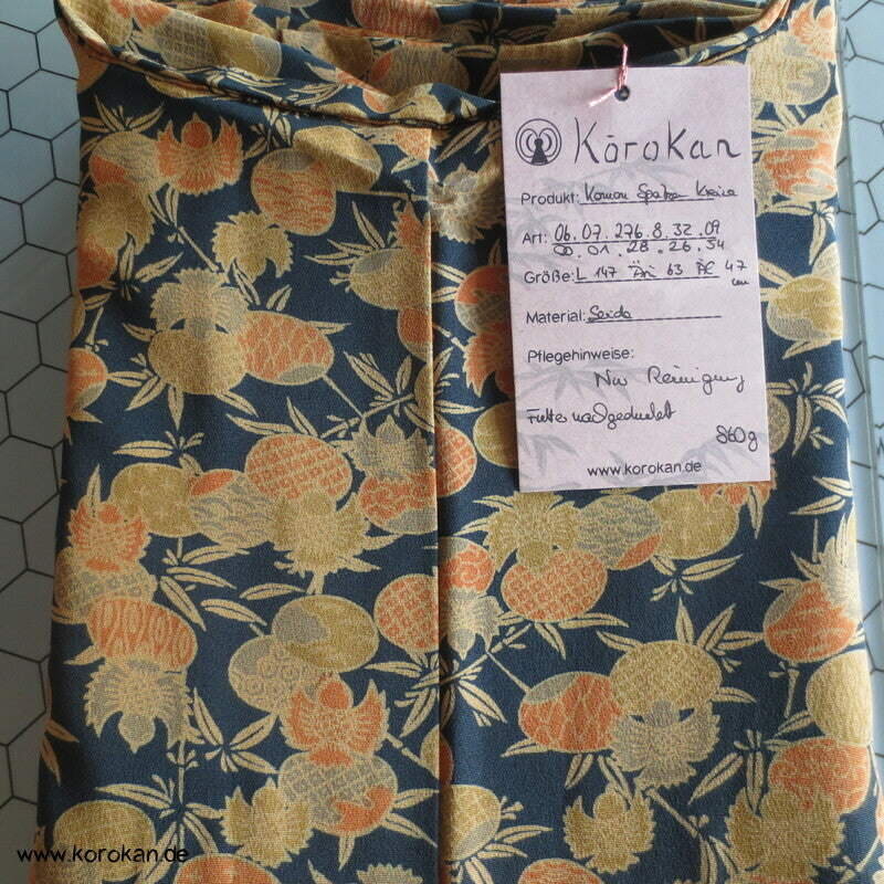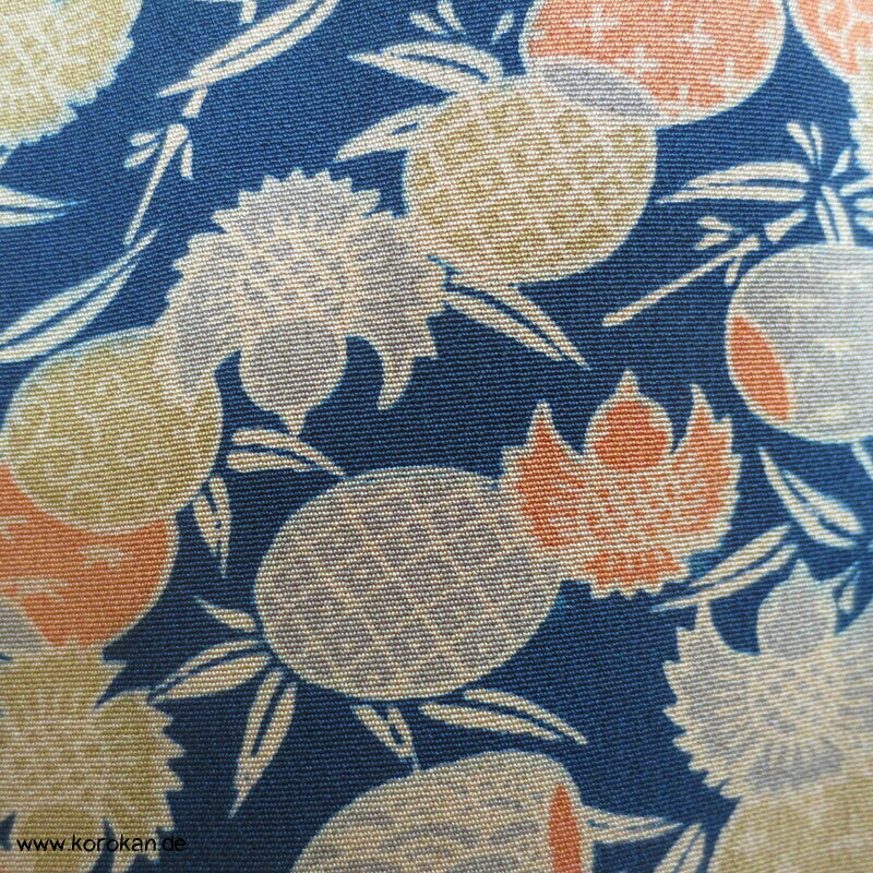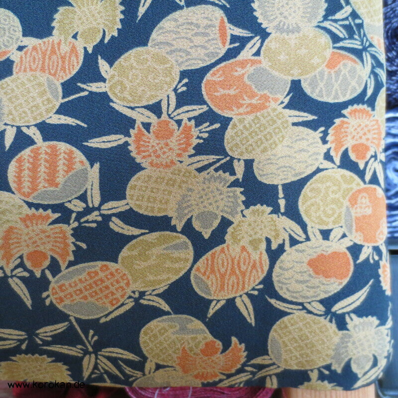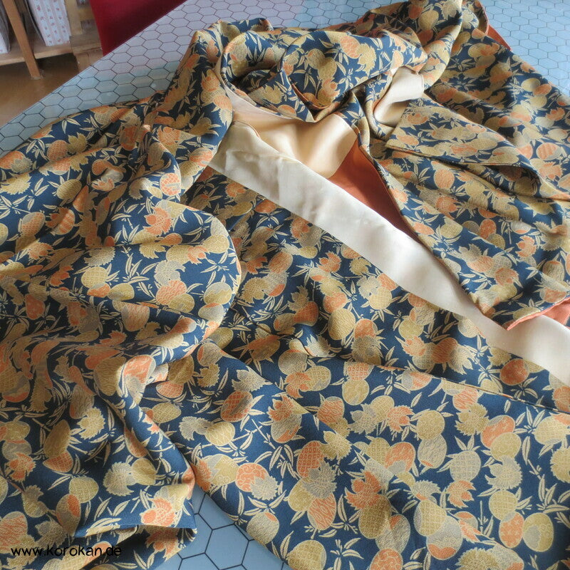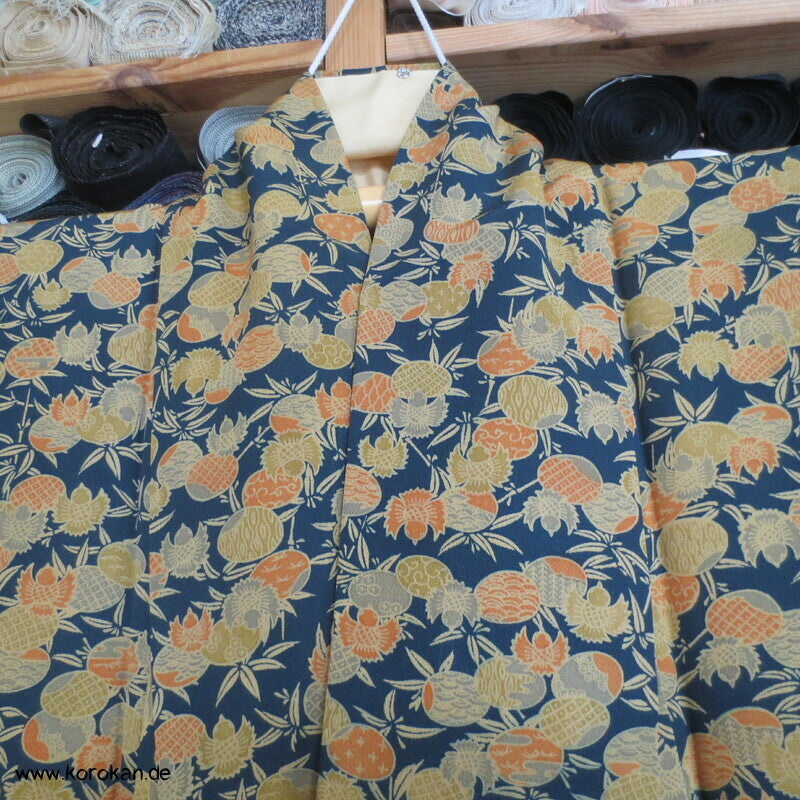 Vintage Komon Kimono Spatzen und Früchte auf petrolblauem Chirimen Seidencrepe, oberem hellen Seiden Futter und unterem Hakkake Futter Seidencrepe rostorange.