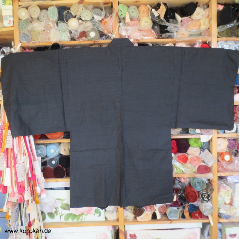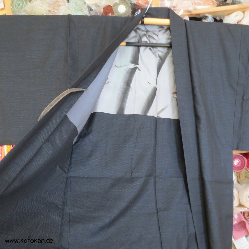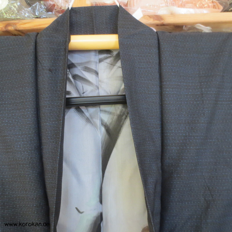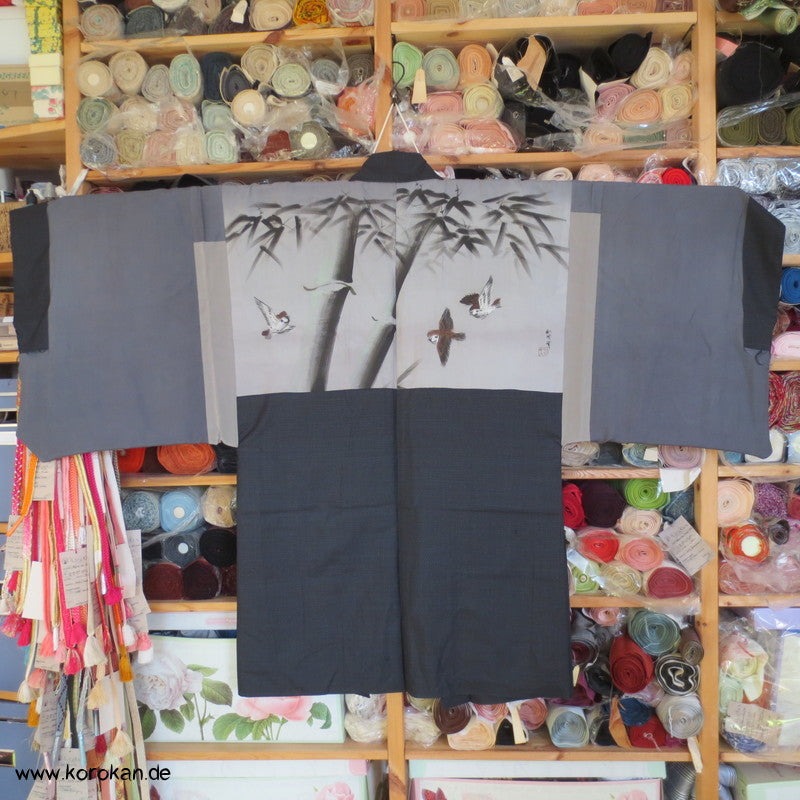 Vintage japanische Männer Haori aus Kasuri garngefärbter leicht kariert blau dunkelblauer Tsumugi Seide mit Seidenfutter handgemalte Spatzen im Bambusbusch mit Künstlersignatur, Mit Himo Bindebändern